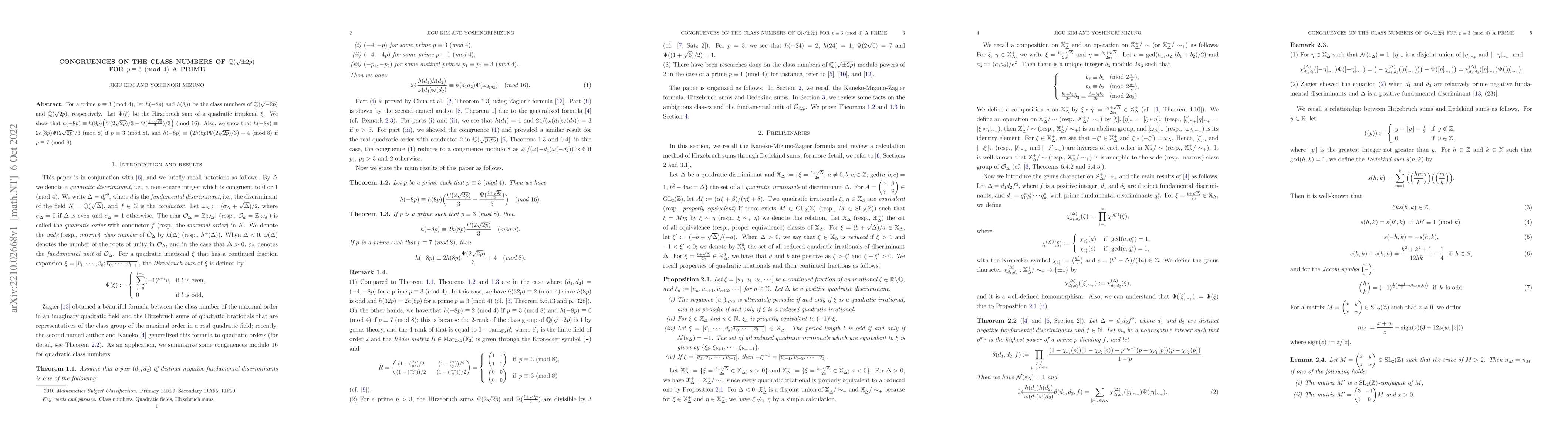 This paper establishes congruences between the class numbers of quadratic fields $\mathbb{Q}(\sqrt{-2p})$ and $\mathbb{Q}(\sqrt{2p})$ for primes $p\equiv 3\ (\text{mod}\ 4)$. It reveals specific modular relations involving these class numbers and the Hirzebruch sum of quadratic irrationals.