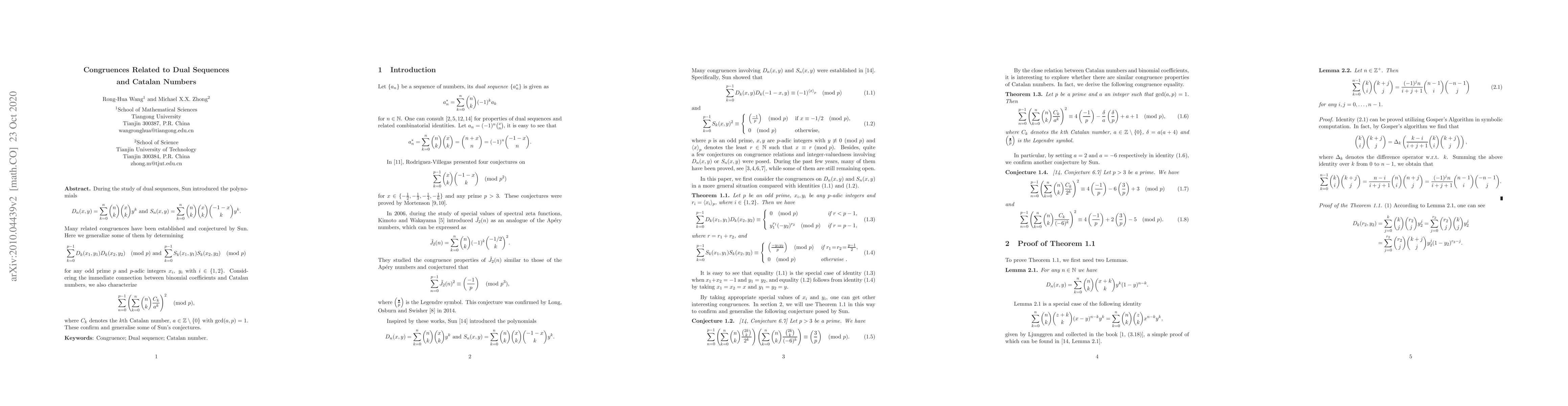 During the study of dual sequences, Sun introduced the polynomials \[ D_n(x,y)=\sum_{k=0}^{n}{n\choose k}{x\choose k}y^k\text{ and } S_n(x,y)=\sum_{k=0}^{n}\binom{n}{k}\binom{x}{k}\binom{-1-x}{k} y^k. \] Many related congruences have been established and conjectured by Sun. Here we generalize some of them by determining \[ \sum_{k=0}^{p-1}D_k(x_1,y_1)D_k(x_2,y_2)\pmod p \text{ and } \sum_{k=0}^{p-1}S_k(x_1,y_1)S_k(x_2,y_2)\pmod p \] for any odd prime $p$ and $p$-adic integers $x_i,\ y_i$ with $i\in\{1,2\}$. Considering the immediate connection between binomial coefficients and Catalan numbers, we also characterize \[ \sum_{n=0}^{p-1}\left(\sum_{k=0}^n {n \choose k} \frac{C_k}{a^k}\right)^2 \pmod {p}, \] where $C_k$ denotes the $k$th Catalan number, $a\in\mathbb{Z}\setminus \{0\}$ with $\gcd(a,p)=1$. These confirm and generalise some of Sun's conjectures.