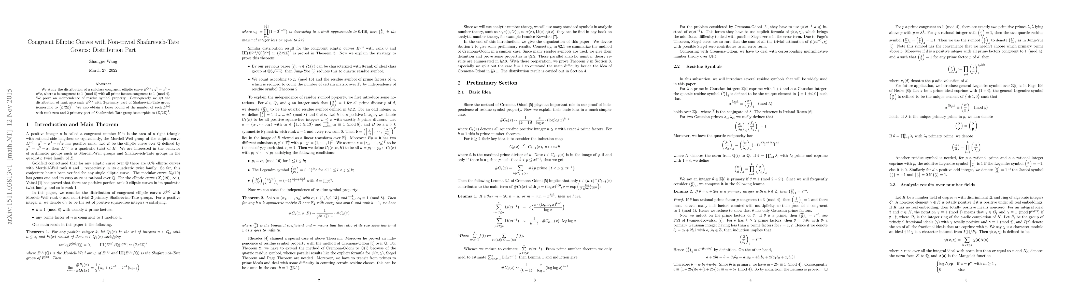 We study the distribution of a subclass congruent elliptic curve $E^{(n)}: y^2=x^3-n^2x$, where $n$ is congruent to $1\pmod 8$ with all prime factors congruent to $1\pmod 4$. We prove an independence of residue symbol property. Consequently we get the distribution of rank zero such $E^{(n)}$ with $2$-primary part of Shafarevich-Tate group isomorphic to $\big(\mathbb Z /2\mathbb Z\big)^2$. We also obtain a lower bound of the number of such $E^{(n)}$ with rank zero and $2$-primary part of Shafarevich-Tate group isomorphic to $\big(\mathbb Z /2\mathbb Z\big)^{4}$.