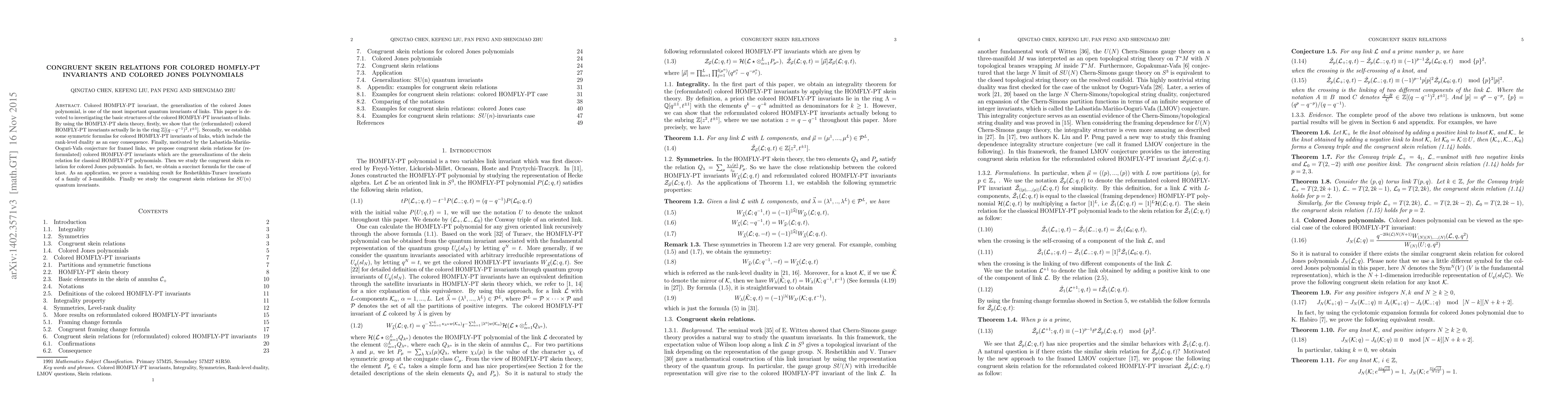 This paper explores the properties of colored HOMFLY-PT invariants, proving they lie in $\mathbb{Z}[(q-q^{-1})^2,t^{\pm 1}]$ and establishing congruent skein relations. It also provides a succinct formula for colored Jones polynomials and proves a vanishing result for Reshetikhin-Turaev invariants.
