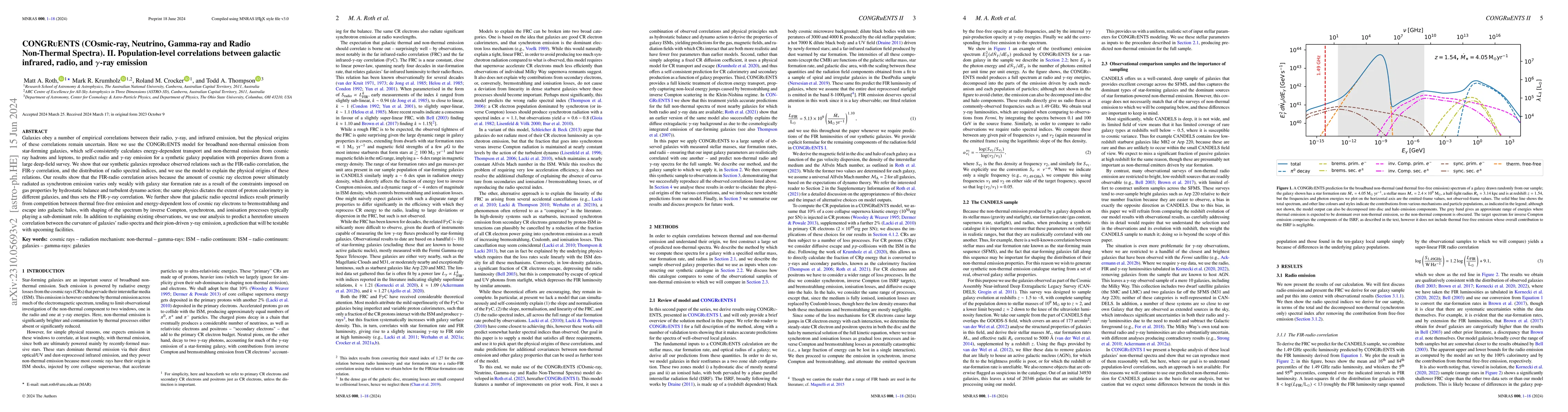 This paper uses the CONGRuENTS model to demonstrate that empirical correlations between galaxies' infrared, radio, and gamma-ray emissions stem from cosmic ray dynamics, and predicts a new correlation between radio spectral curvature and pion-driven gamma-ray emission.