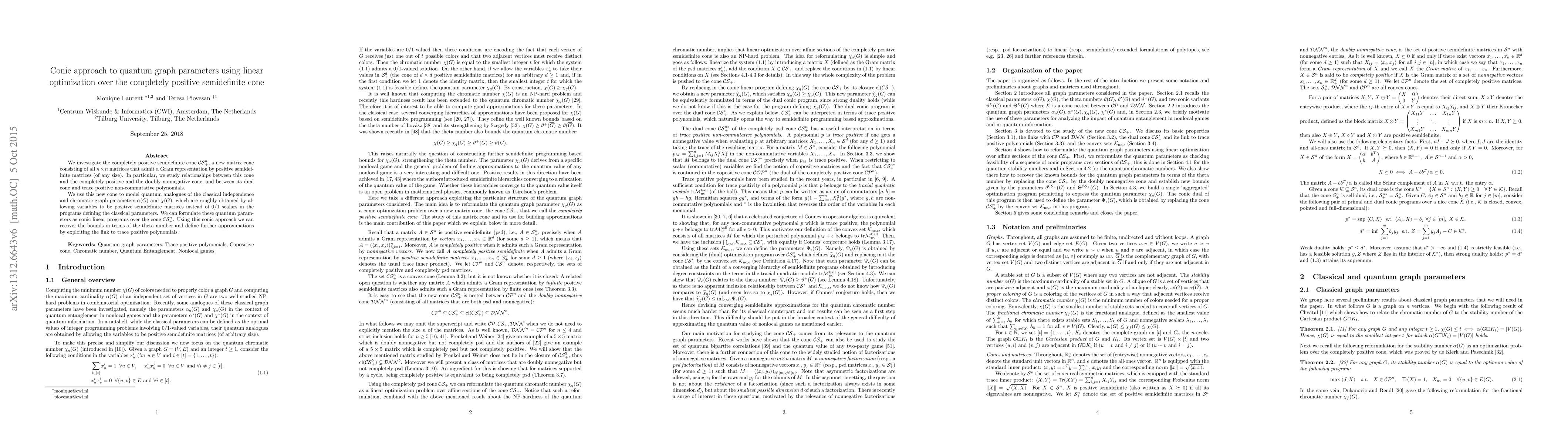 This paper explores the completely positive semidefinite cone $\mathcal{CS}_+^n$ and its relation to other matrix cones, using it to model quantum analogues of classical graph parameters. It formulates quantum versions of independence and chromatic numbers as conic linear programs, leveraging connections to trace positive non-commutative polynomials.