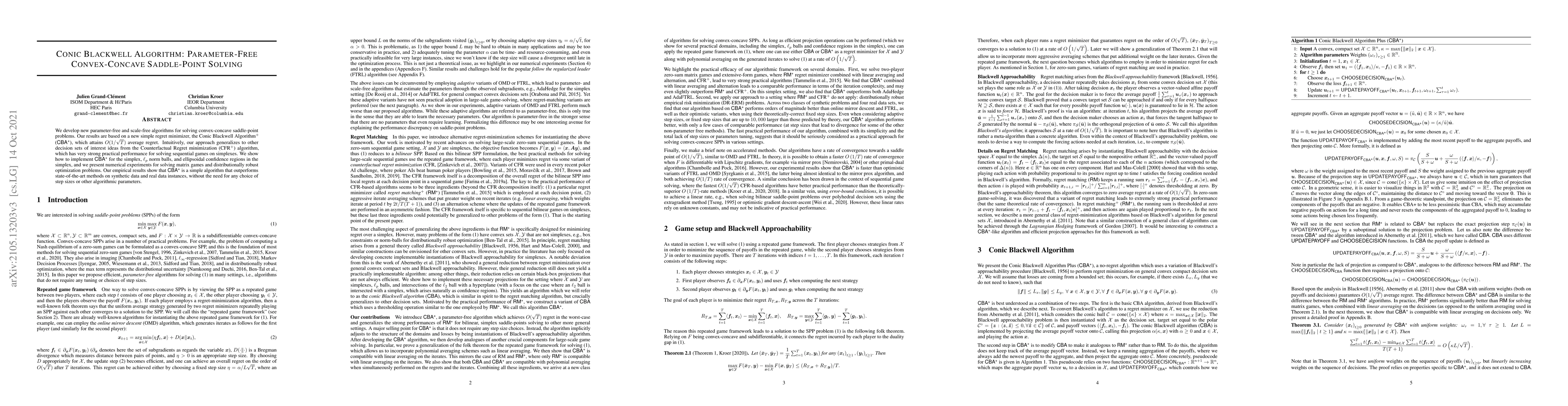 We develop new parameter-free and scale-free algorithms for solving convex-concave saddle-point problems. Our results are based on a new simple regret minimizer, the Conic Blackwell Algorithm$^+$ (CBA$^+$), which attains $O(1/\sqrt{T})$ average regret. Intuitively, our approach generalizes to other decision sets of interest ideas from the Counterfactual Regret minimization (CFR$^+$) algorithm, which has very strong practical performance for solving sequential games on simplexes. We show how to implement CBA$^+$ for the simplex, $\ell_{p}$ norm balls, and ellipsoidal confidence regions in the simplex, and we present numerical experiments for solving matrix games and distributionally robust optimization problems. Our empirical results show that CBA$^+$ is a simple algorithm that outperforms state-of-the-art methods on synthetic data and real data instances, without the need for any choice of step sizes or other algorithmic parameters.