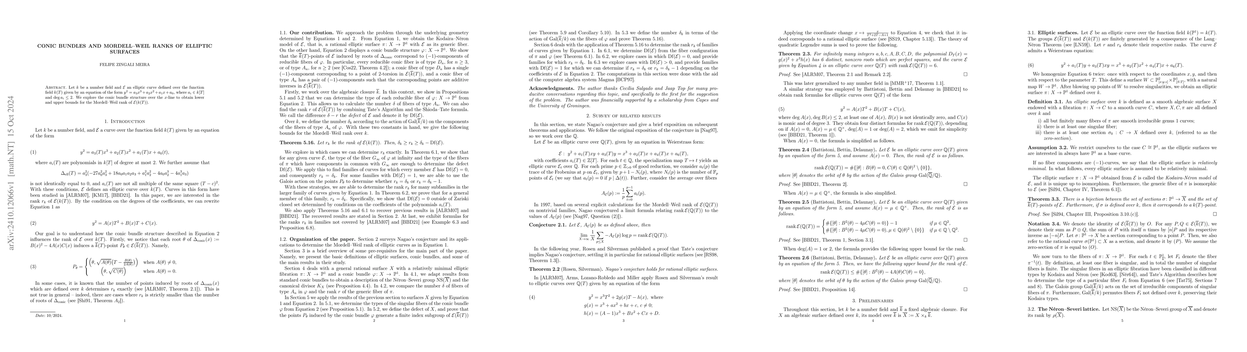 This paper studies an elliptic curve defined over a number field via its conic bundle structure, aiming to derive bounds for the Mordell--Weil rank of the elliptic surface. It utilizes the relationship between the conic bundle and the elliptic surface over the $x$-line to achieve this goal.