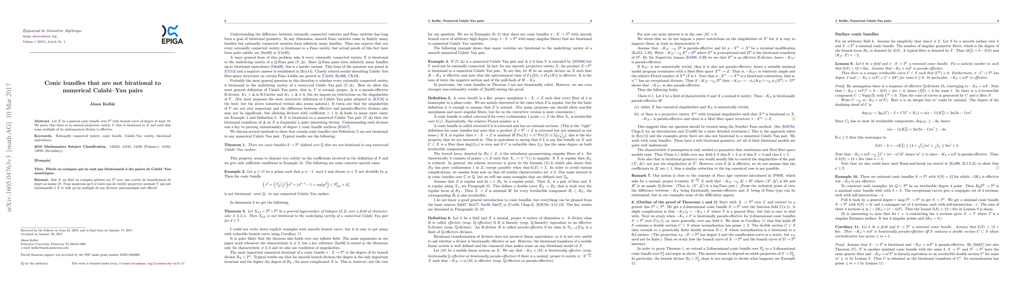 The paper proves that certain conic bundles over the projective plane, specifically those with branch curves of degree at least 19, cannot be birational to any normal projective variety $Y$ where some multiple of its anticanonical divisor is effective. It also provides examples of such birationally distinct conic bundles in the 2-dimensional case over a number field.