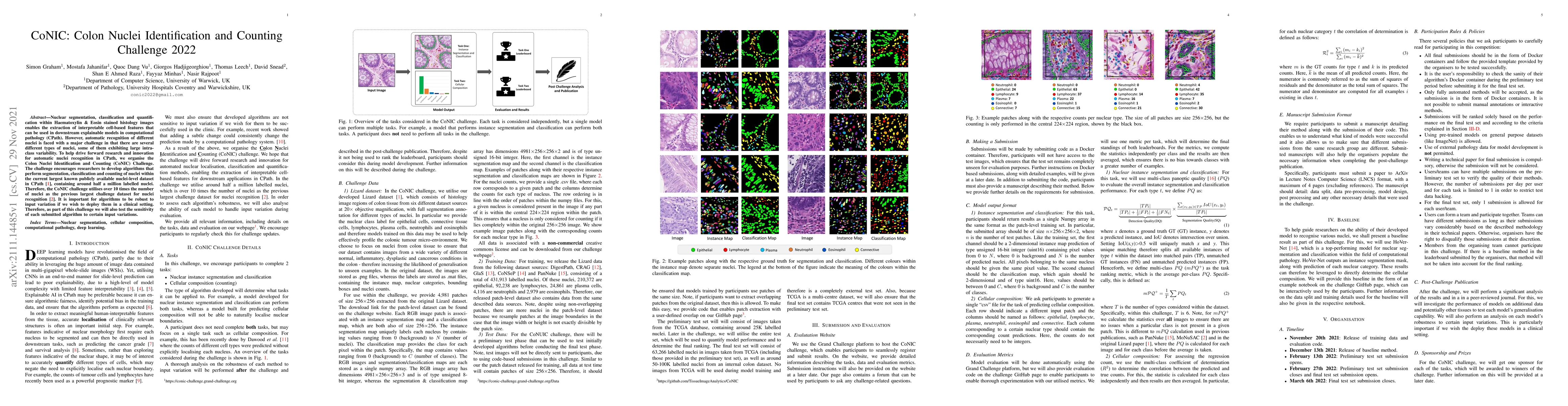 The CoNIC Challenge aims to advance automatic nuclei recognition in computational pathology by organizing a competition to develop algorithms for segmentation, classification, and counting of nuclei in histology images. The challenge utilizes a large dataset with half a million labelled nuclei and tests algorithm robustness to input variations.