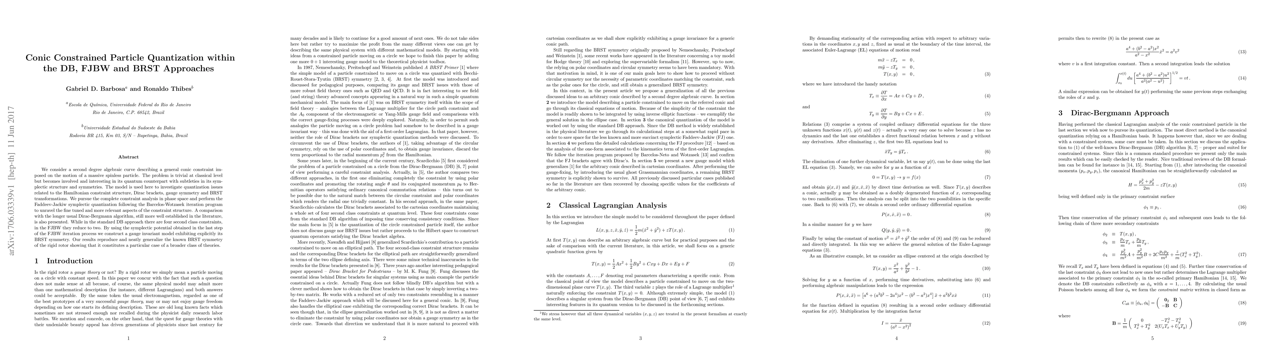 We consider a second degree algebraic curve describing a general conic constraint imposed on the motion of a massive spinless particle. The problem is trivial at classical level but becomes involved and interesting in its quantum counterpart with subtleties in its symplectic structure and symmetries. The model is used here to investigate quantization issues related to the Hamiltonian constraint structure, Dirac brackets, gauge symmetry and BRST transformations. We pursue the complete constraint analysis in phase space and perform the Faddeev-Jackiw symplectic quantization following the Barcelos-Wotzasek iteration program to unravel the fine tuned and more relevant aspects of the constraint structure. A comparison with the longer usual Dirac-Bergmann algorithm, still more well established in the literature, is also presented. While in the standard DB approach there are four second class constraints, in the FJBW they reduce to two. By using the symplectic potential obtained in the last step of the FJBW iteration process we construct a gauge invariant model exhibiting explicitly its BRST symmetry. Our results reproduce and neatly generalize the known BRST symmetry of the rigid rotor showing that it constitutes a particular case of a broader class of theories.