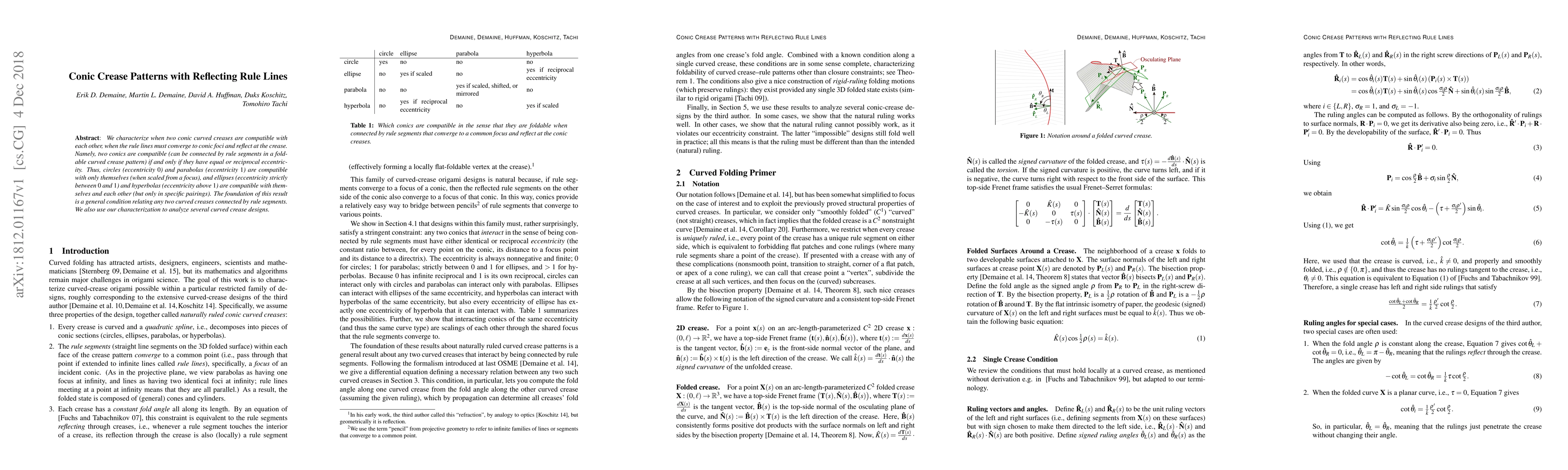 We characterize when two conic curved creases are compatible with each other, when the rule lines must converge to conic foci and reflect at the crease. Namely, two conics are compatible (can be connected by rule segments in a foldable curved crease pattern) if and only if they have equal or reciprocal eccentricity. Thus, circles (eccentricity 0) and parabolas (eccentricity 1) are compatible with only themselves (when scaled from a focus), and ellipses (eccentricity strictly between 0 and 1) and hyperbolas (eccentricity above 1) are compatible with themselves and each other (but only in specific pairings). The foundation of this result is a general condition relating any two curved creases connected by rule segments. We also use our characterization to analyze several curved crease designs.