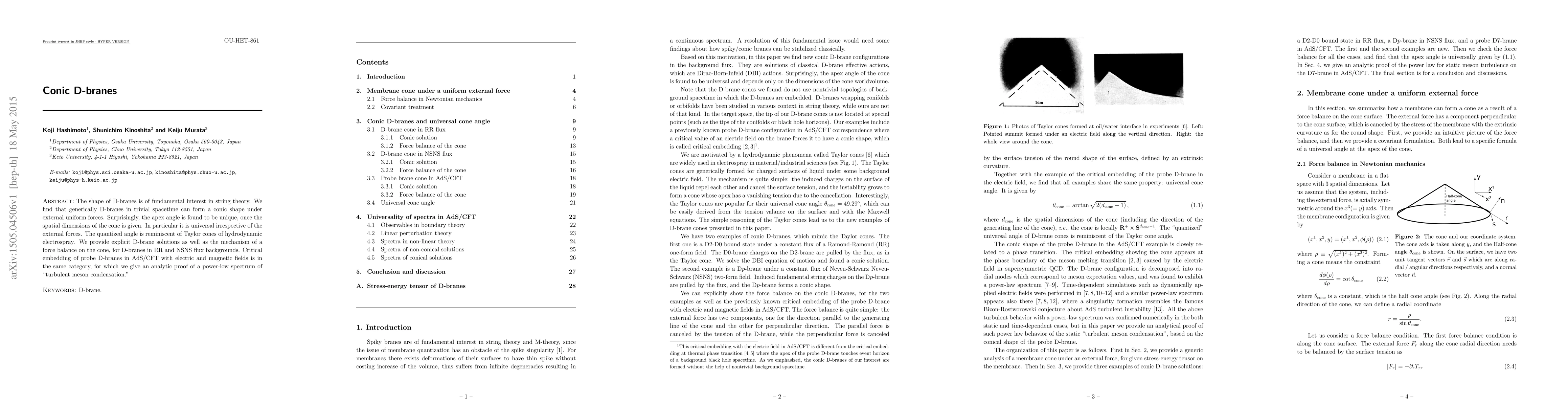 This paper explores the shape of D-branes in string theory, discovering that D-branes can form conic shapes under uniform external forces, with a unique apex angle that is universal regardless of the forces. It also provides explicit solutions and mechanisms for force balance in various flux backgrounds, and an analytic proof for the power-law spectrum in turbulent meson condensation in AdS/CFT.