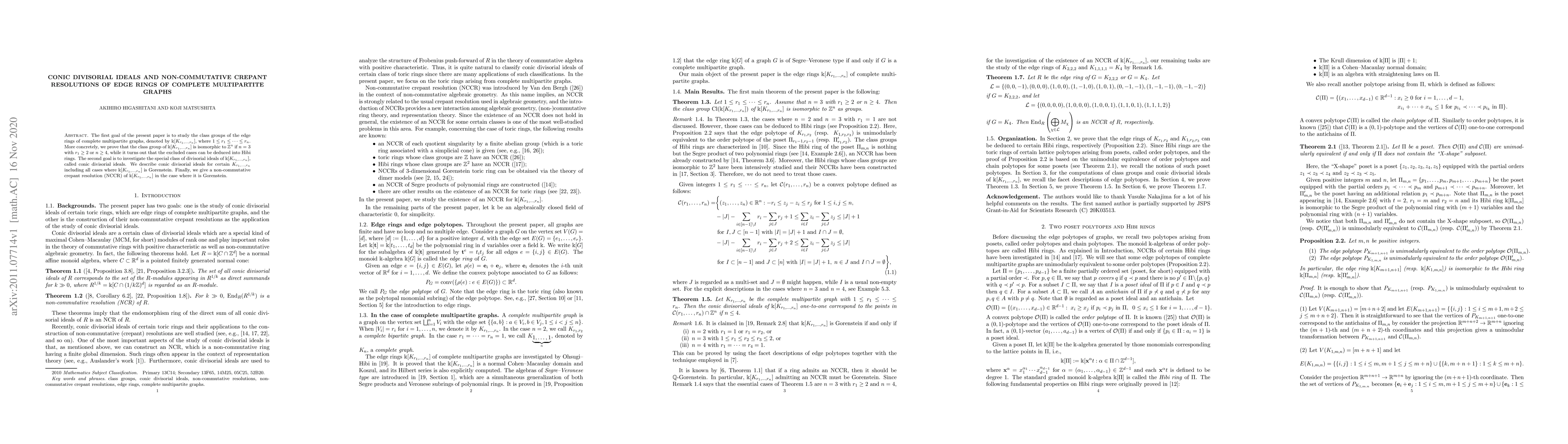 This paper studies the class groups of edge rings of complete multipartite graphs, proving that their class group is isomorphic to $\mathbb{Z}^n$ for certain configurations, and explores conic divisorial ideals, providing a non-commutative crepant resolution for Gorenstein cases.