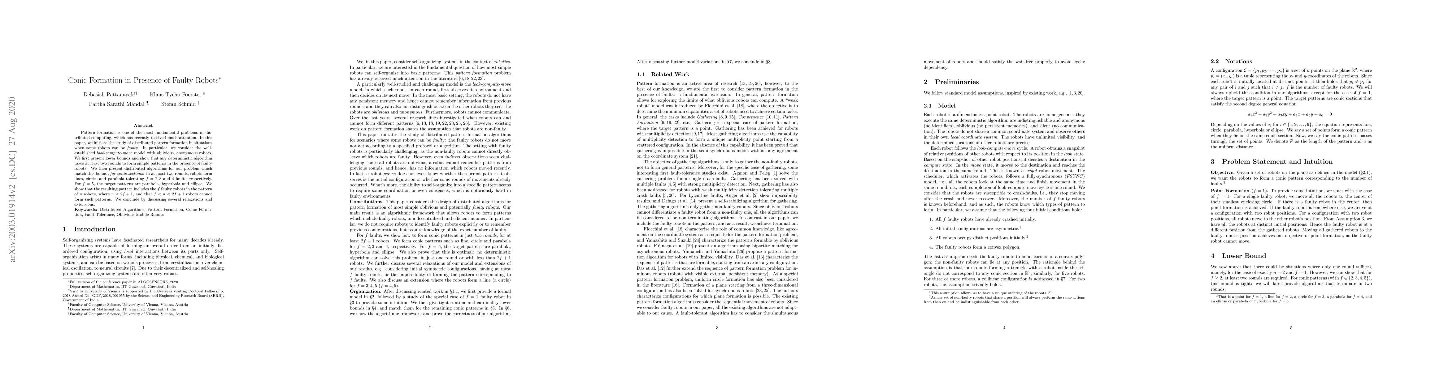 Pattern formation is one of the most fundamental problems in distributed computing, which has recently received much attention. In this paper, we initiate the study of distributed pattern formation in situations when some robots can be \textit{faulty}. In particular, we consider the well-established \textit{look-compute-move} model with oblivious, anonymous robots. We first present lower bounds and show that any deterministic algorithm takes at least two rounds to form simple patterns in the presence of faulty robots. We then present distributed algorithms for our problem which match this bound, \textit{for conic sections}: in at most two rounds, robots form lines, circles and parabola tolerating $f=2,3$ and $4$ faults, respectively. For $f=5$, the target patterns are parabola, hyperbola and ellipse. We show that the resulting pattern includes the $f$ faulty robots in the pattern of $n$ robots, where $n \geq 2f+1$, and that $f < n < 2f+1$ robots cannot form such patterns. We conclude by discussing several relaxations and extensions.