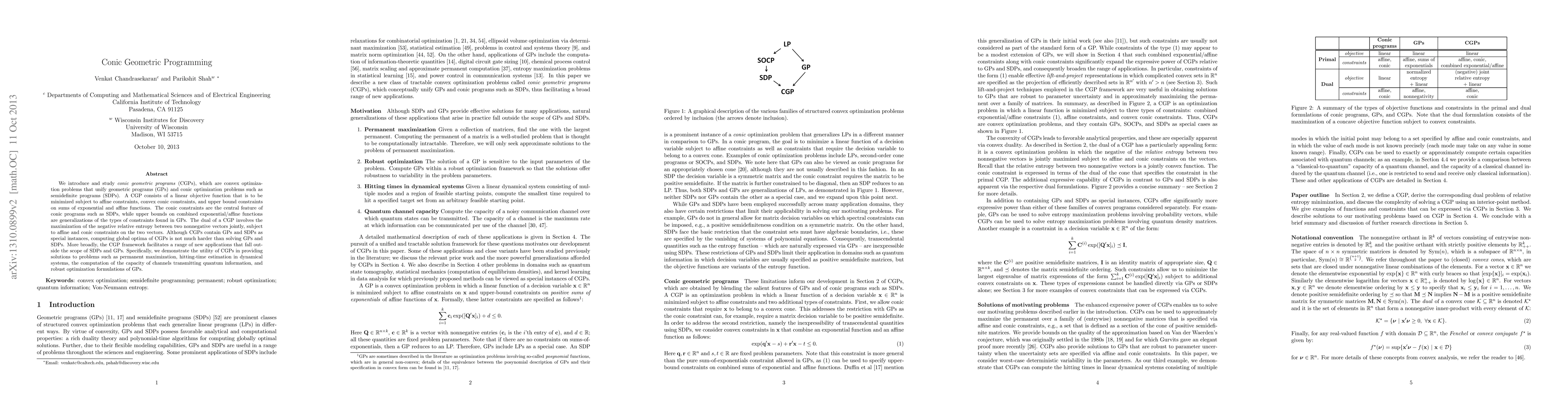 This paper introduces conic geometric programs (CGPs), a class of convex optimization problems that combine geometric programs (GPs) and conic optimization problems like semidefinite programs (SDPs). The authors demonstrate that solving CGPs is tractable and highlight their utility in various applications beyond traditional GPs and SDPs, including permanent maximization and quantum information channel capacity computation.