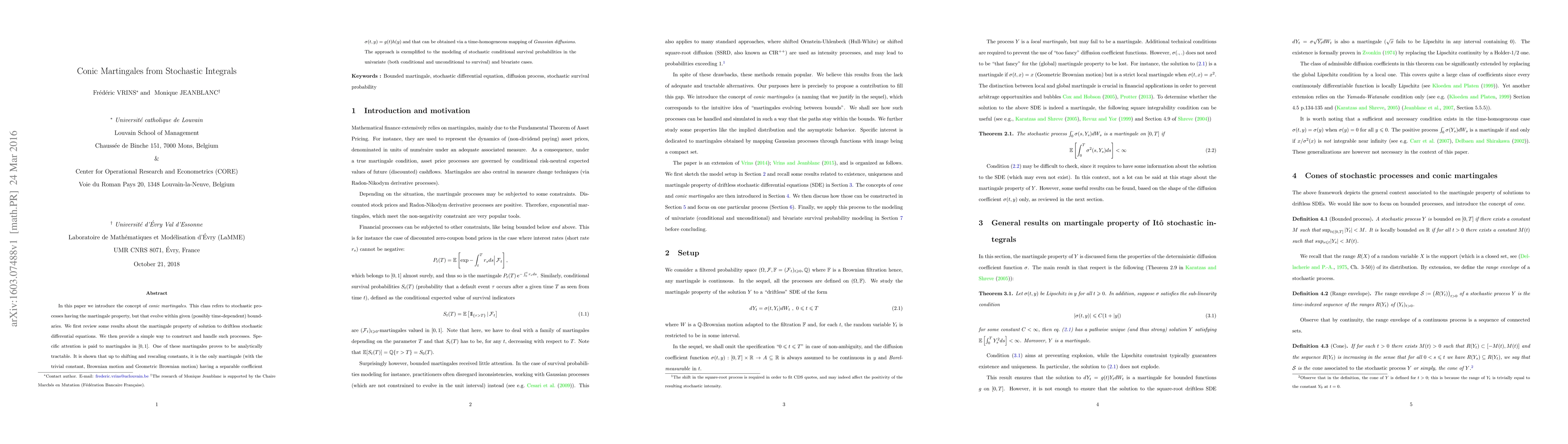This paper introduces conic martingales, stochastic processes with the martingale property evolving within specified boundaries, and provides a method for constructing such processes. It highlights a tractable martingale in $[0,1]$ that is unique under certain conditions, and applies the approach to model stochastic conditional survival probabilities.