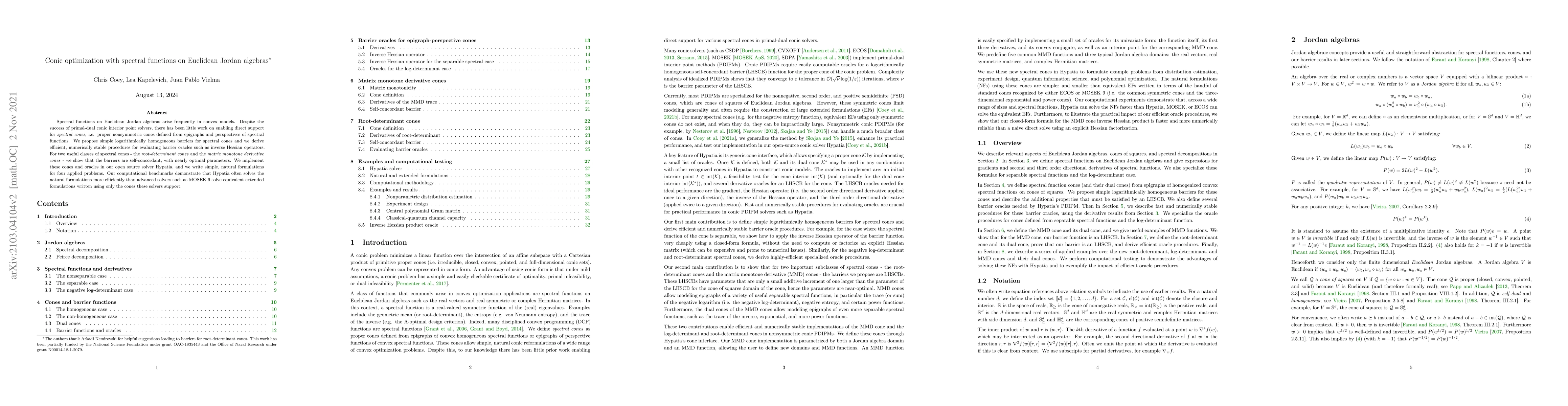 This paper proposes new logarithmically homogeneous barriers for spectral cones on Euclidean Jordan algebras and presents efficient procedures for evaluating barrier oracles. It demonstrates the self-concordance of the proposed barriers for root-determinant and matrix monotone derivative cones, and showcases the efficiency of the implemented solver Hypatia in solving applied problems compared to other solvers.