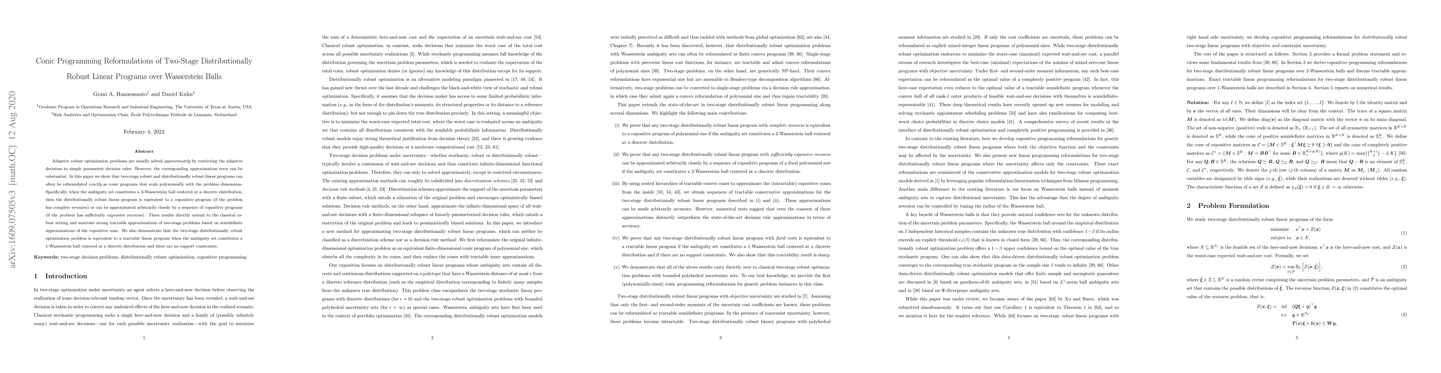 This paper reformulates two-stage distributionally robust linear programs over Wasserstein balls as conic programs, showing exact equivalence for 2-Wasserstein balls and tractable approximations for 1-Wasserstein balls. The reformulations enable polynomial-scale solutions and extend to classical robust settings.