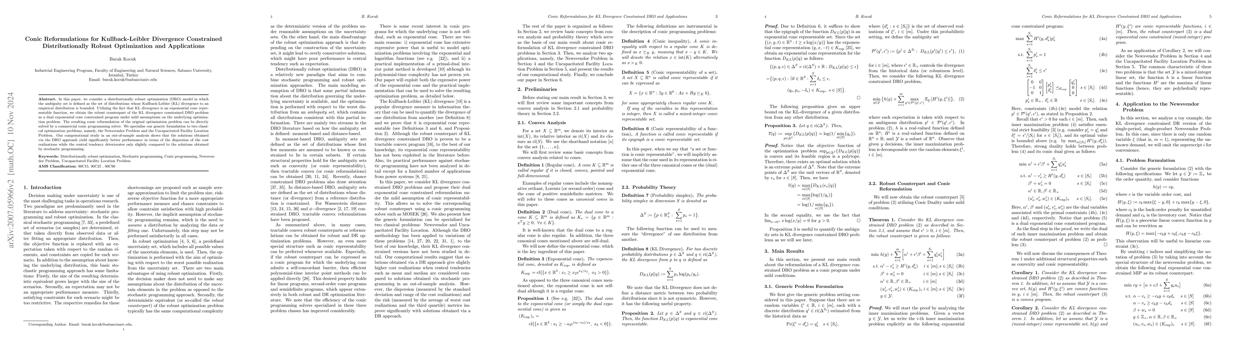 This paper reformulates a distributionally robust optimization (DRO) model using conic programming, leveraging the exponential cone representability of Kullback-Leibler divergence. The reformulation leads to a dual exponential cone constrained program that can be solved using commercial solvers, and it is shown to improve cost dispersion in applications like the Newsvendor and Uncapacitated Facility Location Problems.