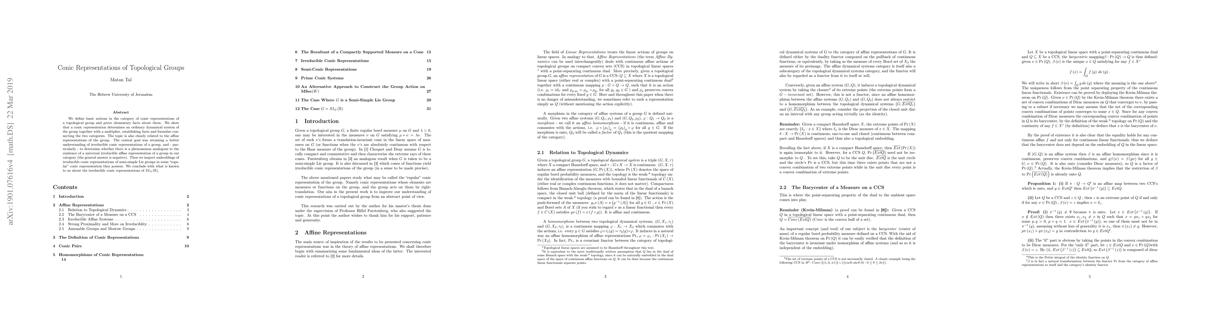 We define basic notions in the category of conic representations of a topological group and prove elementary facts about them. We show that a conic representation determines an ordinary dynamical system of the group together with a multiplier, establishing facts and formulae connecting the two categories. The topic is also closely related to the affine representations of the group. The central goal was attaining a better understanding of irreducible conic representations of a group, and - particularly - to determine whether there is a phenomenon analogous to the existence of a universal irreducible affine representation of a group in our category (the general answer is negative). Then we inspect embeddings of irreducible conic representations of semi-simple Lie groups in some "regular" conic representation they possess. We conclude with what is known to us about the irreducible conic representations of $SL_{2}\left(\mathbb{R}\right)$.