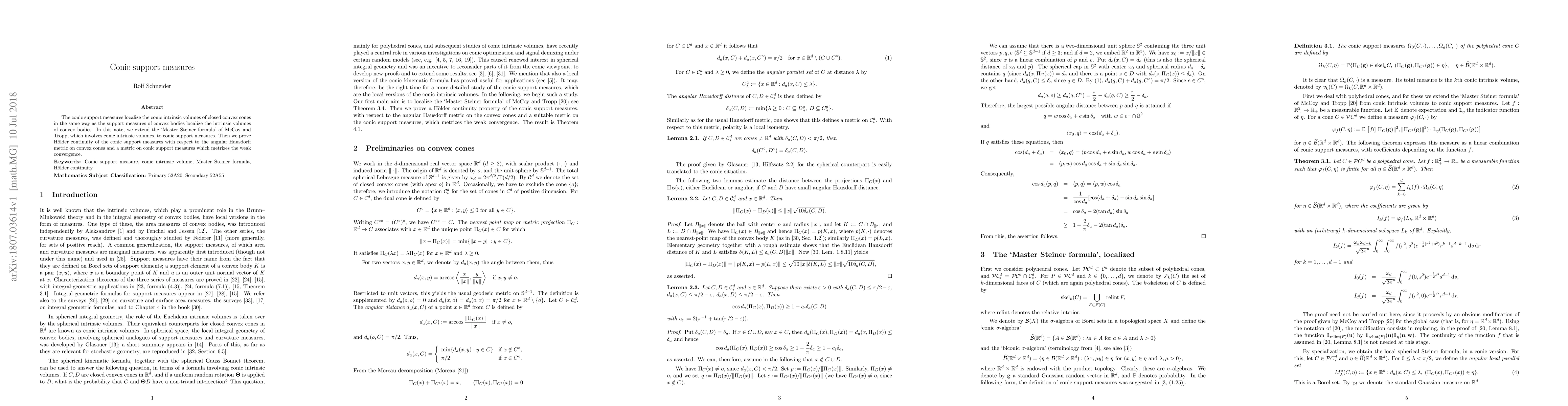 The conic support measures localize the conic intrinsic volumes of closed convex cones in the same way as the support measures of convex bodies localize the intrinsic volumes of convex bodies. In this note, we extend the `Master Steiner formula' of McCoy and Tropp, which involves conic intrinsic volumes, to conic support measures. Then we prove H\"{o}lder continuity of the conic support measures with respect to the angular Hausdorff metric on convex cones and a metric on conic support measures which metrizes the weak convergence.
