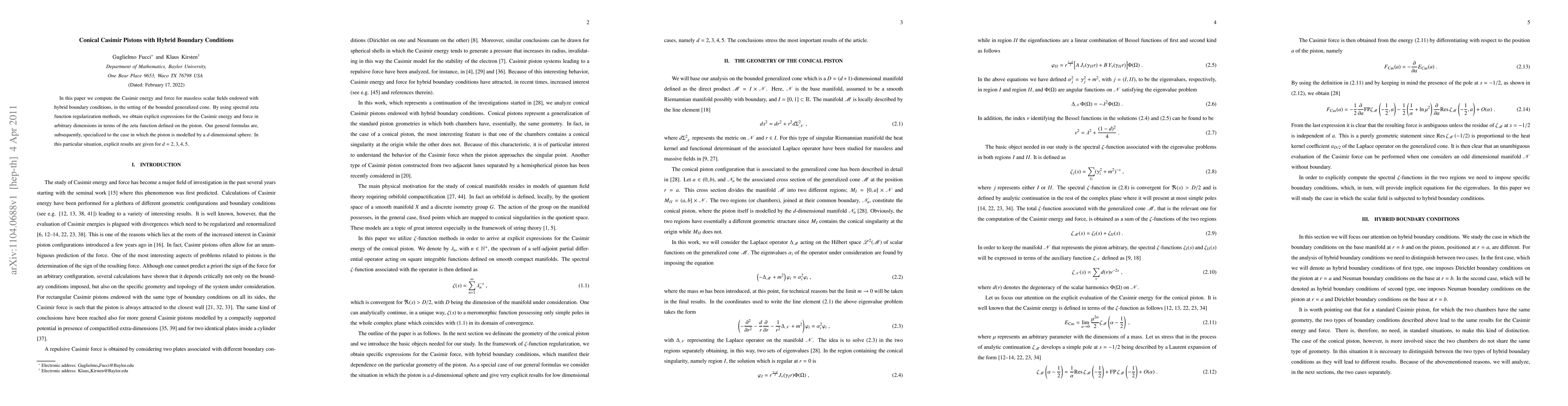 This paper calculates the Casimir energy and force for massless scalar fields with hybrid boundary conditions in a bounded generalized cone, using spectral zeta function regularization. Explicit formulas are derived in arbitrary dimensions and applied to a $d$-dimensional spherical piston, yielding results for $d=2,3,4,5$.
