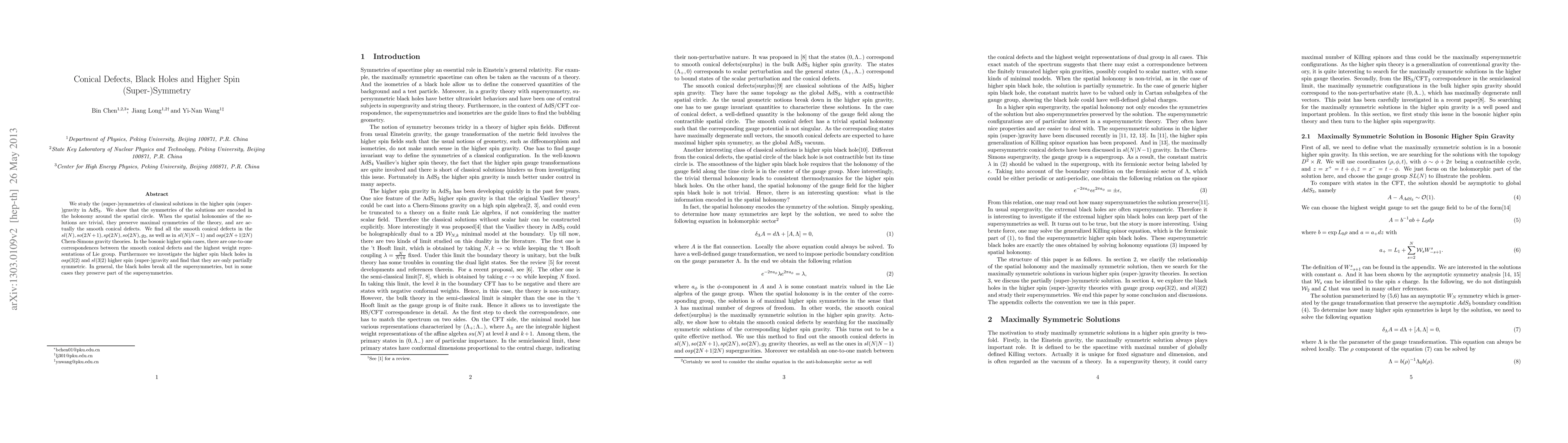 This paper investigates the symmetries of classical solutions in higher spin (super-)gravity in AdS$_3$, showing that their symmetries are encoded in the holonomy around the spatial circle. It identifies all smooth conical defects in various Chern-Simons gravity theories and discusses the partial symmetries of higher spin black holes in $osp(3|2)$ and $sl(3|2)$ higher spin (super-)gravity, noting that while black holes generally break all supersymmetries, they may preserve some in specific cases.