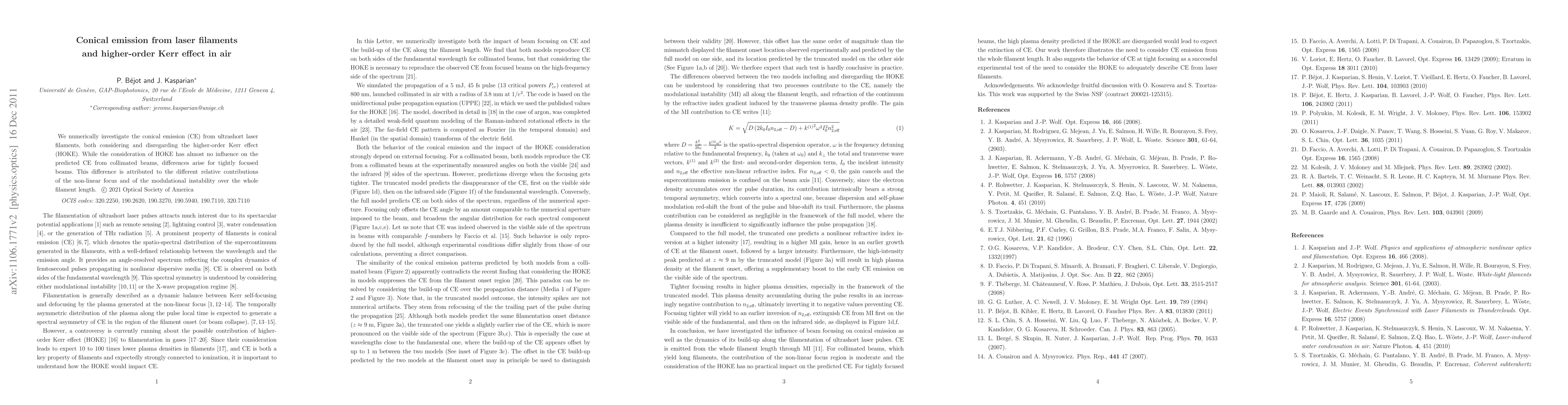 This study numerically explores conical emission from laser filaments, highlighting that while higher-order Kerr effect (HOKE) minimally affects predictions for collimated beams, it significantly alters outcomes for tightly focused beams due to varying contributions of non-linear focus and modulational instability.