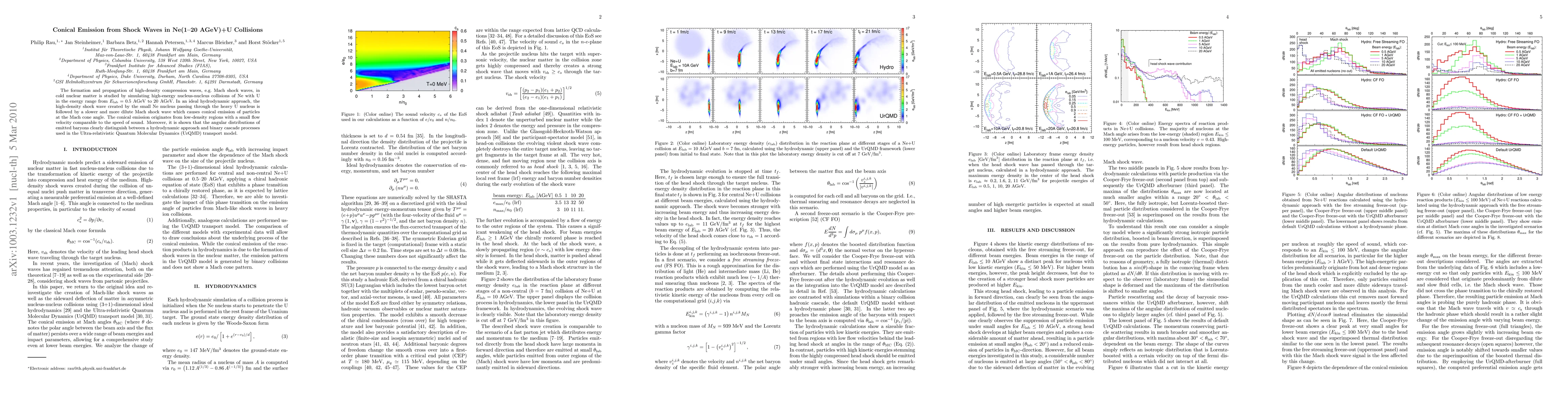 The formation and propagation of high-density compression waves, e.g. Mach shock waves, in cold nuclear matter is studied by simulating high-energy nucleus-nucleus collisions of Ne with U in the energy range from E_lab = 0.5 AGeV to 20 AGeV. In an ideal hydrodynamic approach, the high-density shock wave created by the small Ne nucleus passing through the heavy U nucleus is followed by a slower and more dilute Mach shock wave which causes conical emission of particles at the Mach cone angle. The conical emission originates from low-density regions with a small flow velocity comparable to the speed of sound. Moreover, it is shown that the angular distributions of emitted baryons clearly distinguish between a hydrodynamic approach and binary cascade processes used in the Ultra-relativistic Quantum Molecular Dynamics (UrQMD) transport model.