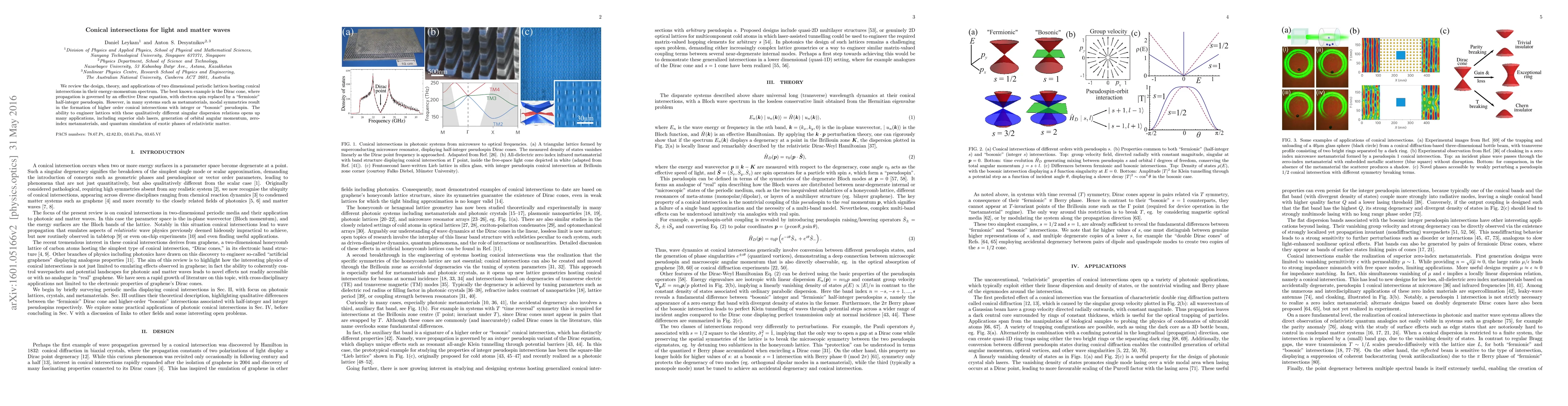We review the design, theory, and applications of two dimensional periodic lattices hosting conical intersections in their energy-momentum spectrum. The best known example is the Dirac cone, where propagation is governed by an effective Dirac equation, with electron spin replaced by a "fermionic" half-integer pseudospin. However, in many systems such as metamaterials, modal symmetries result in the formation of higher order conical intersections with integer or "bosonic" pseudospin. The ability to engineer lattices with these qualitatively different singular dispersion relations opens up many applications, including superior slab lasers, generation of orbital angular momentum, zero-index metamaterials, and quantum simulation of exotic phases of relativistic matter.