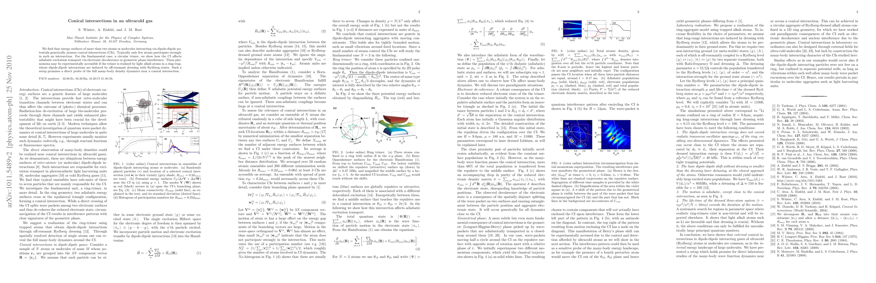 We find that energy surfaces of more than two atoms or molecules interacting via dipole-dipole po- tentials generically possess conical intersections (CIs). Typically only few atoms participate strongly in such an intersection. For the fundamental case, a circular trimer, we show how the CI affects adiabatic excitation transport via electronic decoherence or geometric phase interference. These phe- nomena may be experimentally accessible if the trimer is realized by light alkali atoms in a ring trap, whose dipole-dipole interactions are induced by off-resonant dressing with Rydberg states. Such a setup promises a direct probe of the full many-body density dynamics near a conical intersection.