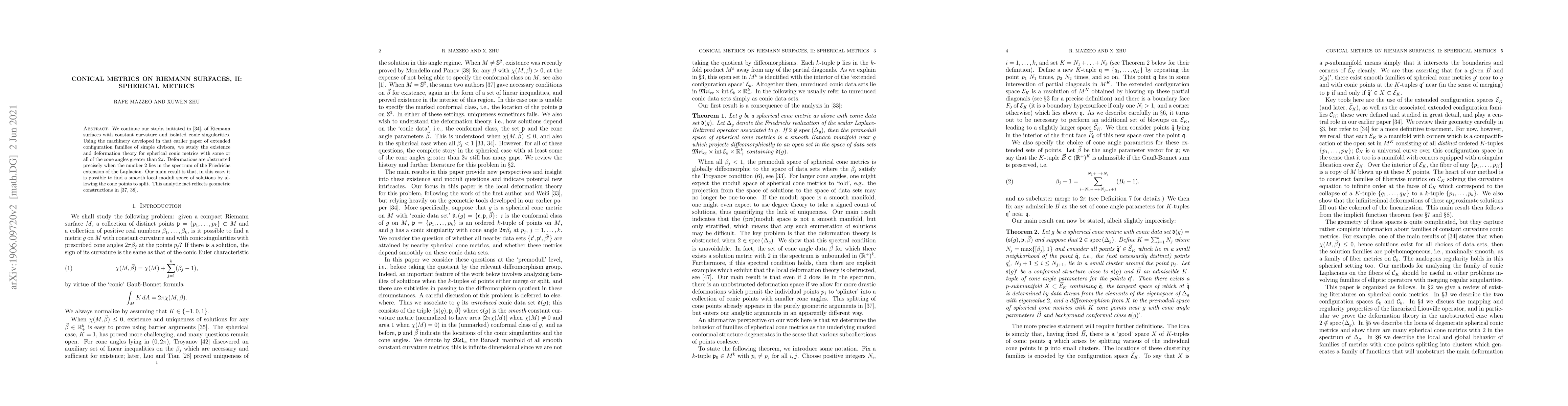 We continue our study, initiated in our earlier paper, of Riemann surfaces with constant curvature and isolated conic singularities. Using the machinery developed in that earlier paper of extended configuration families of simple divisors, we study the existence and deformation theory for spherical conic metrics with some or all of the cone angles greater than $2\pi$. Deformations are obstructed precisely when the number $2$ lies in the spectrum of the Friedrichs extension of the Laplacian. Our main result is that, in this case, it is possible to find a smooth local moduli space of solutions by allowing the cone points to split. This analytic fact reflects geometric constructions in papers by Mondello and Panov.