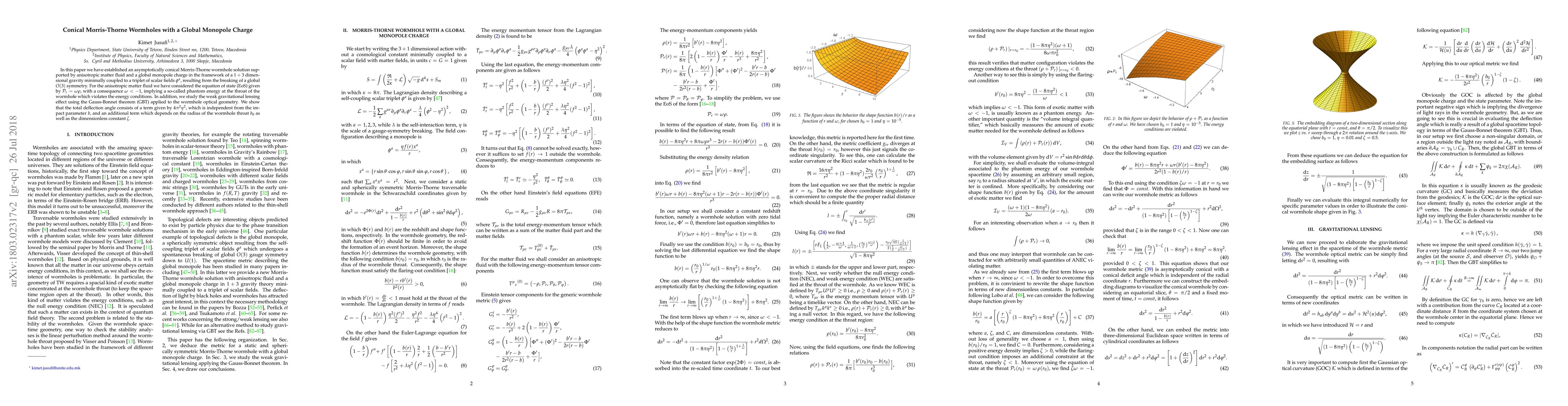 In this paper we have established an asymptotically conical Morris-Thorne wormhole solution supported by anisotropic matter fluid and a global monopole charge in the framework of a $1+3$ dimensional gravity minimally coupled to a triplet of scalar fields $\phi^a$, resulting from the breaking of a global $O(3)$ symmetry. For the anisotropic matter fluid we have considered the equation of state (EoS) given by $\mathcal{P}_r=\omega \rho$, with a consequence $\omega<-1$, implying a so-called phantom energy at the throat of the wormhole which violates the energy conditions. In addition, we study the weak gravitational lensing effect using the Gauss-Bonnet theorem (GBT) applied to the wormhole optical geometry. We show that the total deflection angle consists of a term given by $4\pi^2 \eta^2 $, which is independent from the impact parameter $b$, and an additional term which depends on the radius of the wormhole throat $b_0$ as well as the dimensionless constant $\zeta$.