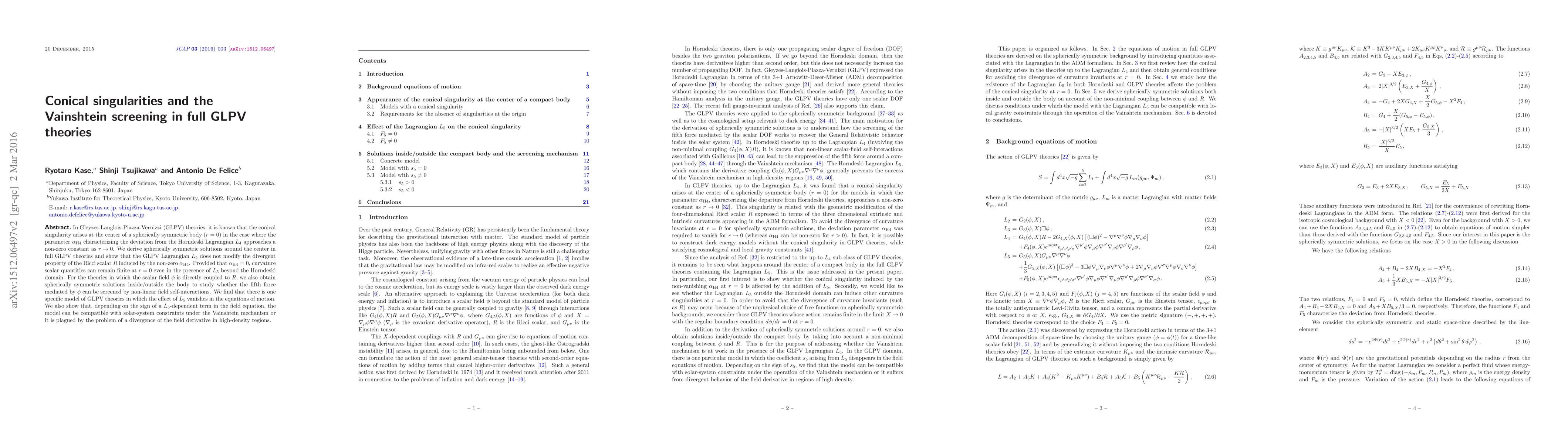 This paper investigates conical singularities in Gleyzes-Langlois-Piazza-Vernizzi (GLPV) theories, demonstrating that the GLPV Lagrangian $L_5$ does not alter the divergent property of the Ricci scalar $R$ when $\alpha_{{\rm H}4}$ approaches a non-zero constant. It also explores Vainshtein screening in these theories, identifying a specific model where $L_5$ effects vanish, potentially allowing compatibility with solar-system constraints or causing divergence issues in high-density regions.