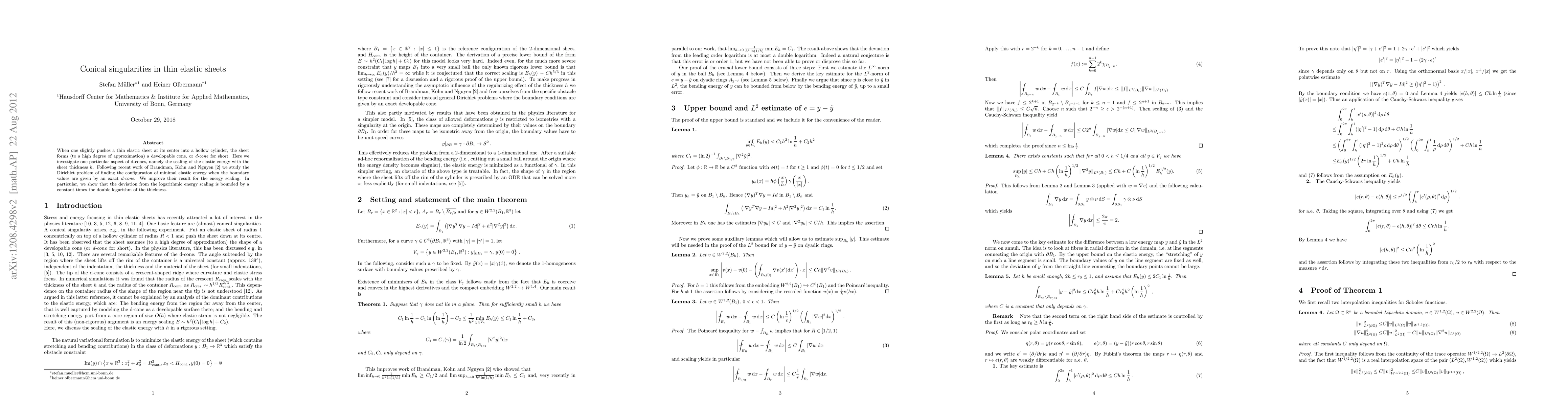 Title: Conical singularities in thin elastic sheets Summary: The paper examines the elastic energy scaling in thin elastic sheets forming developable cones, improving on previous work by showing the deviation from logarithmic scaling is bounded by a double logarithm of the sheet thickness.