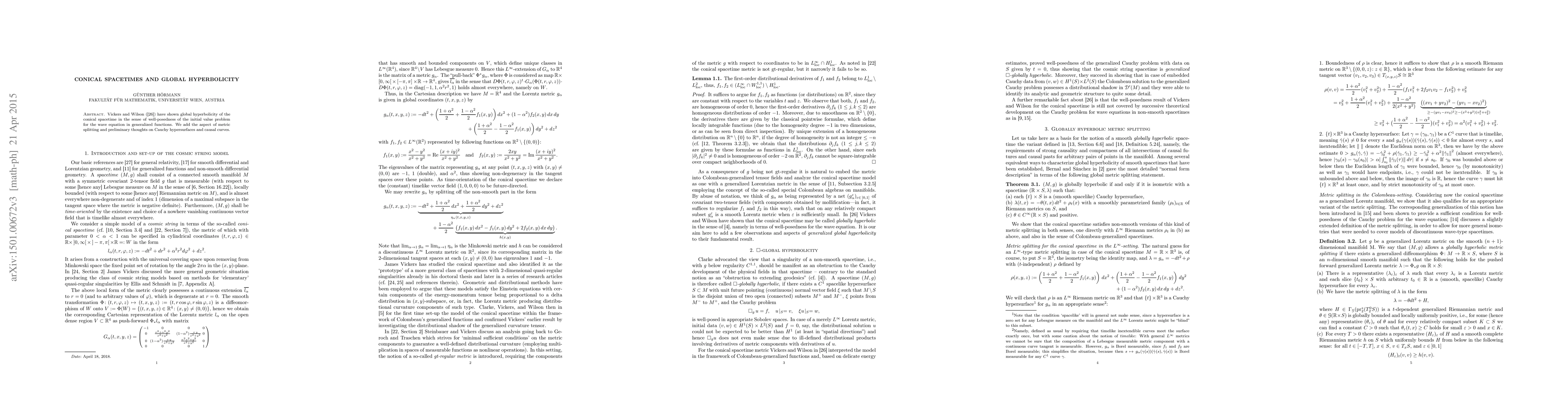 Vickers and Wilson demonstrated global hyperbolicity in conical spacetimes for the wave equation's initial value problem. This paper further explores metric splitting and introduces preliminary ideas on Cauchy hypersurfaces and causal curves.