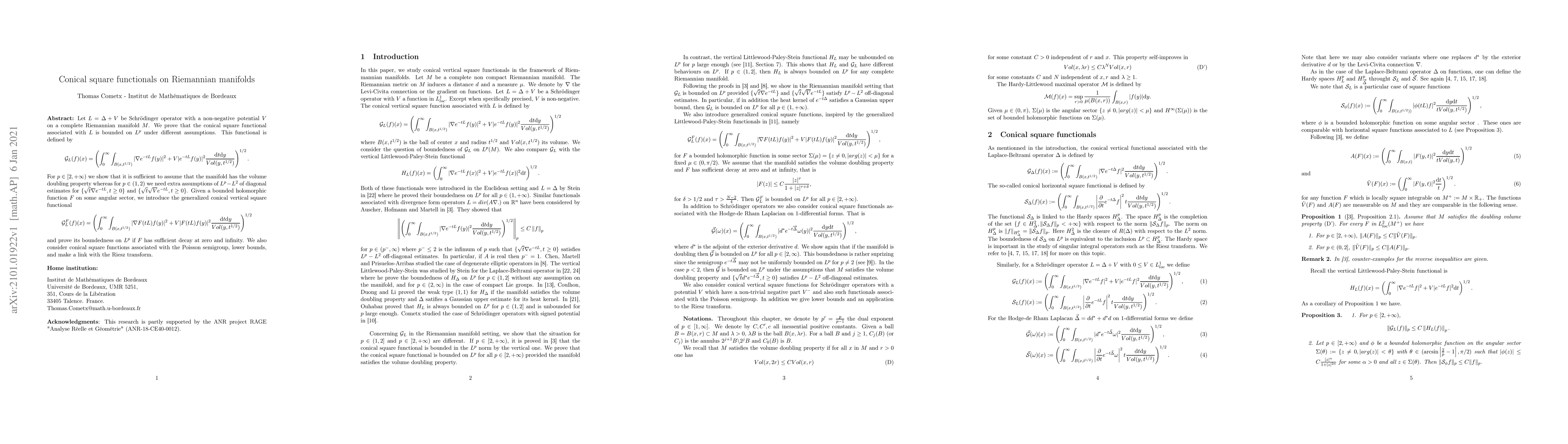 The paper establishes boundedness criteria for conical square functionals associated with Schrödinger operators on Riemannian manifolds, extending previous work on Littlewood-Paley-Stein theory.