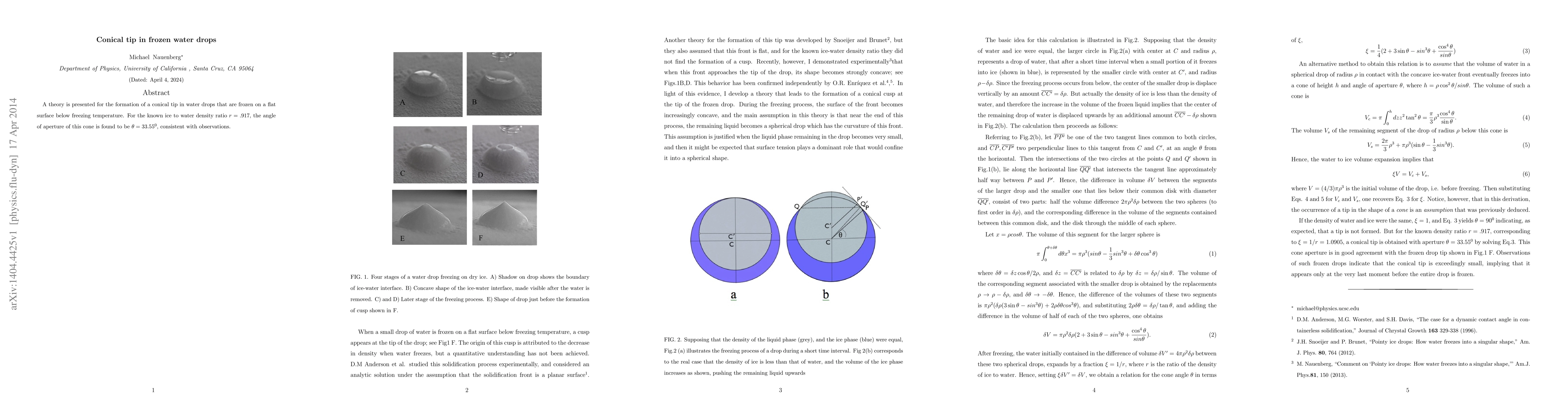 Researchers propose a theory for conical tip formation in frozen water drops on flat surfaces, finding an angle of 33.55 degrees consistent with observations for the given ice to water density ratio.