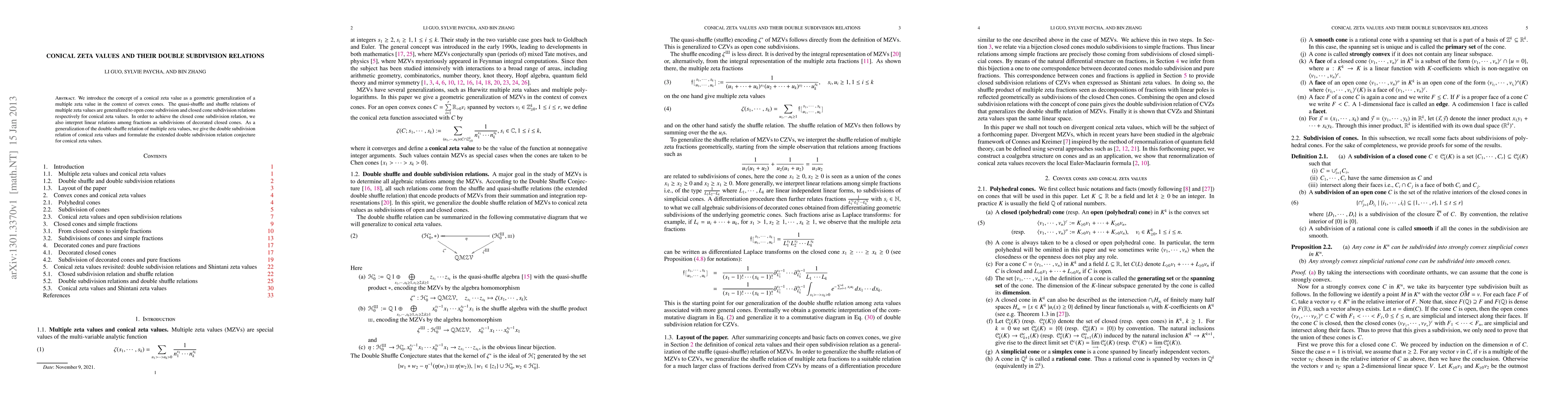 This paper introduces conical zeta values as a geometric generalization of multiple zeta values within the framework of convex cones. It generalizes quasi-shuffle and shuffle relations to open and closed cone subdivision relations, and formulates a conjecture for an extended double subdivision relation.