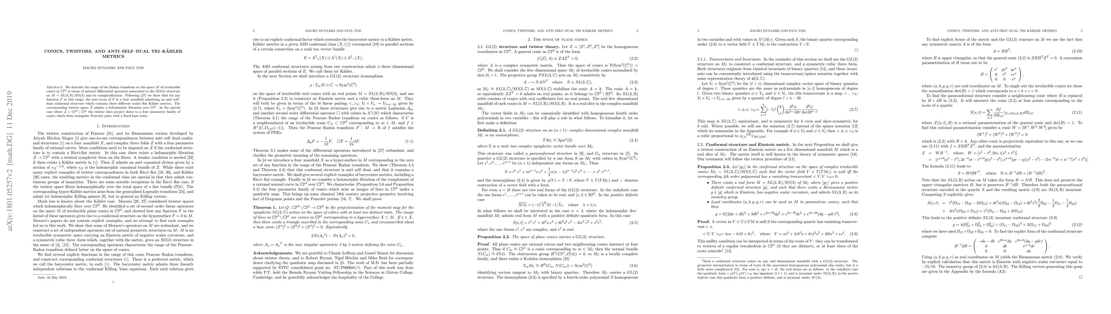 This paper explores the Radon transform on the space of irreducible conics in $\CP^2$ and relates it to $SO(3)$-structure and complexification. It demonstrates that the zero locus of functions in the transform's range forms a four-manifold with an anti-self-dual conformal structure and three scalar-flat Kähler metrics, whose twistor space exhibits a holomorphic fibration over $\CP^2$.
