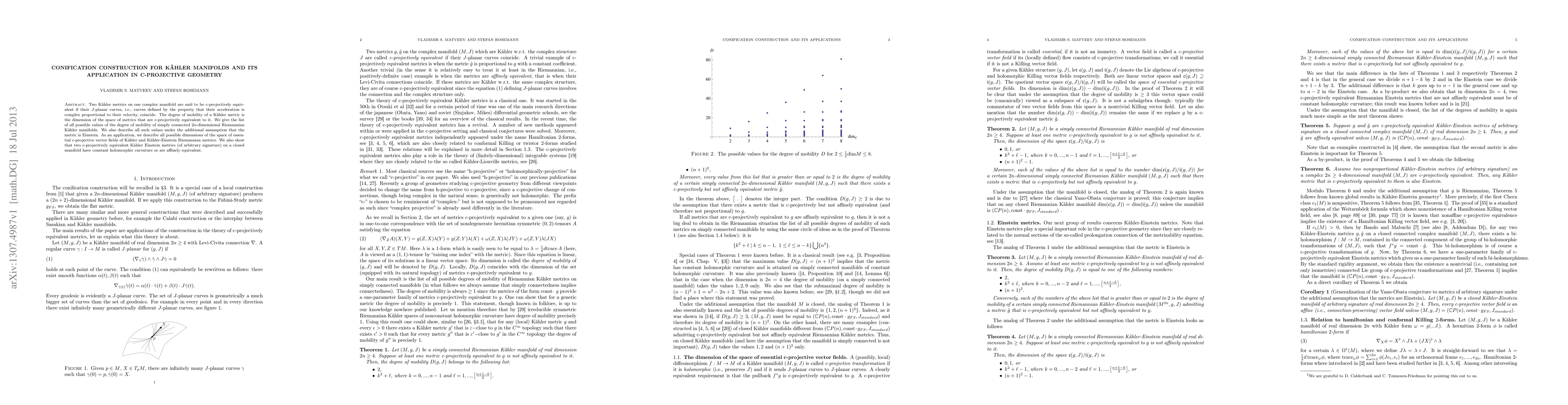 Two Kaehler metrics on one complex manifold are said to be c-projectively equivalent if their J-planar curves, i.e., curves defined by the property that their acceleration is complex proportional to their velocity, coincide. The degree of mobility of a Kaehler metric is the dimension of the space of metrics that are c-projectively equivalent to it. We give the list of all possible values of the degree of mobility of simply connected 2n-dimensional Riemannian Kaehler manifolds. We also describe all such values under the additional assumption that the metric is Einstein. As an application, we describe all possible dimensions of the space of essential c-projective vector fields of Kaehler and Kaehler-Einstein Riemannian metrics. We also show that two c-projectively equivalent Kaehler Einstein metrics (of arbitrary signature) on a closed manifold have constant holomorphic curvature or are affinely equivalent.
