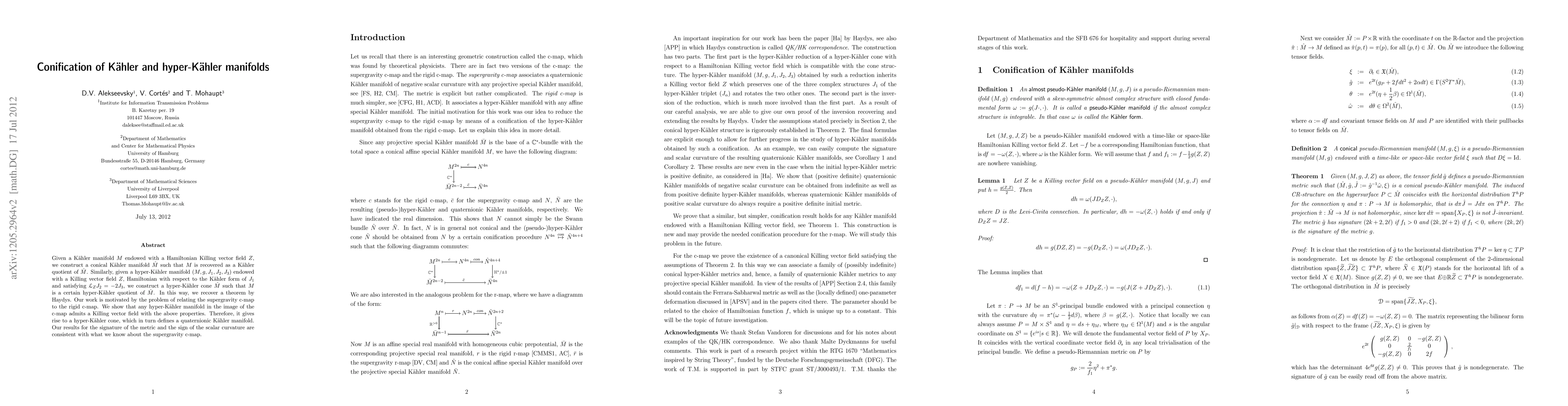 This paper constructs conical Kähler and hyper-Kähler manifolds from given Kähler and hyper-Kähler manifolds with specific Killing vector fields. It recovers a theorem by Haydys and links these constructions to the supergravity c-map, showing that certain hyper-Kähler manifolds yield quaternionic Kähler structures.