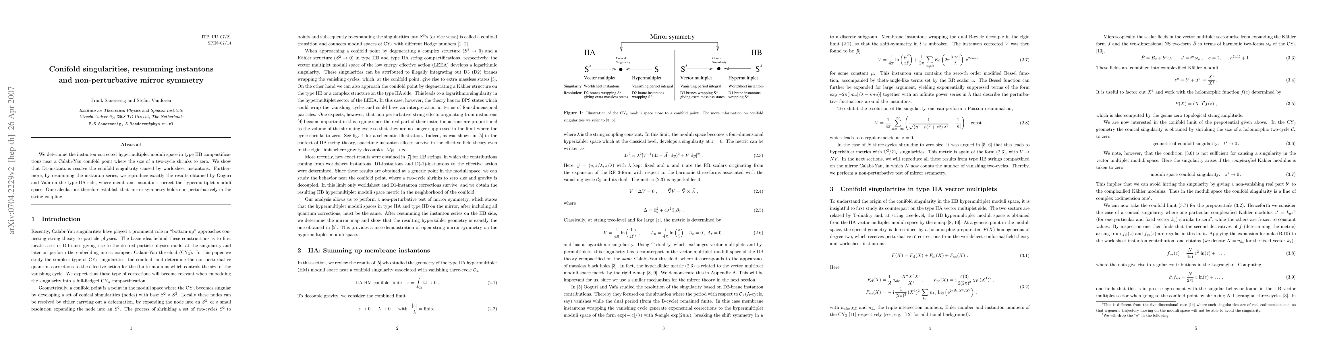 This paper investigates instanton corrections in type IIB compactifications near conifold singularities, showing D1-instantons resolve the singularity. It demonstrates that resumming the instanton series verifies non-perturbative mirror symmetry through results derived from membrane instantons in type IIA compactifications.