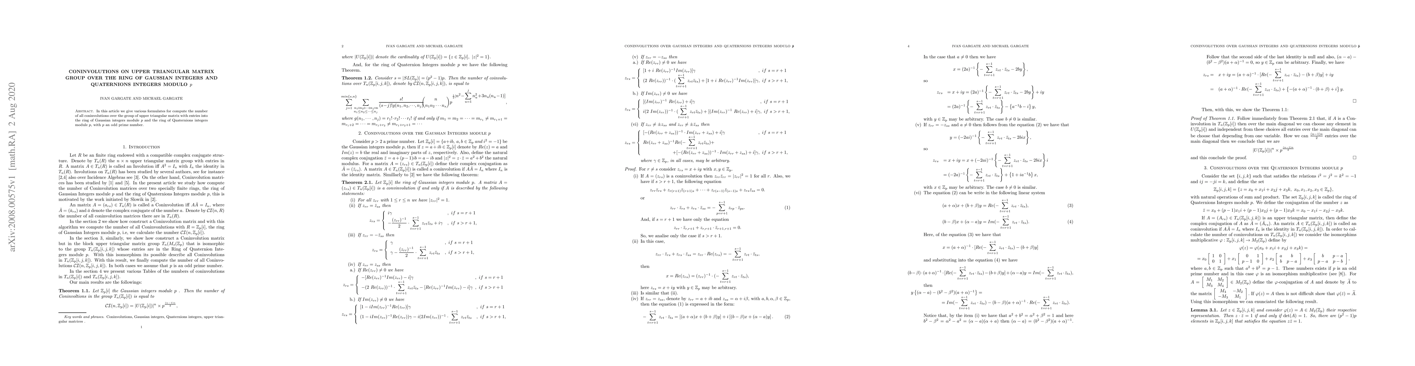 In this article we give various formulates for compute the number of all coninvolutions over the group of upper triangular matrix with entries into the ring of Gaussian integers module $p$ and the ring of Quaternions integers module $p$, with $p$ an odd prime number.