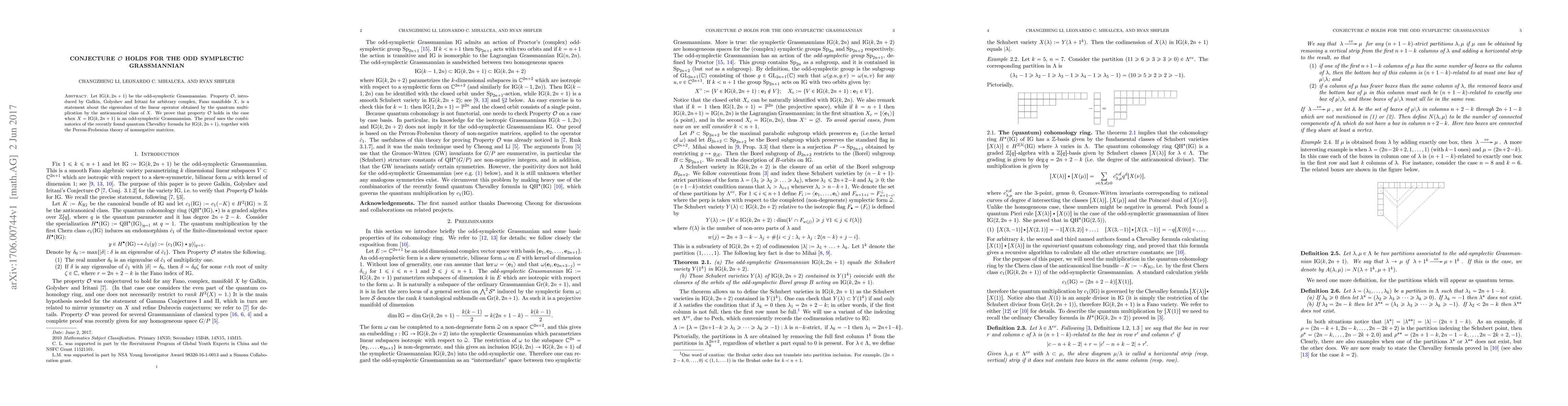 This paper proves that Conjecture $\mathcal{O}$ holds for the odd symplectic Grassmannian $\mathrm{IG}(k, 2n+1)$ by leveraging the quantum Chevalley formula and Perron-Frobenius theory of nonnegative matrices. The result pertains to the eigenvalues of the linear operator derived from quantum multiplication by the anticanonical class.