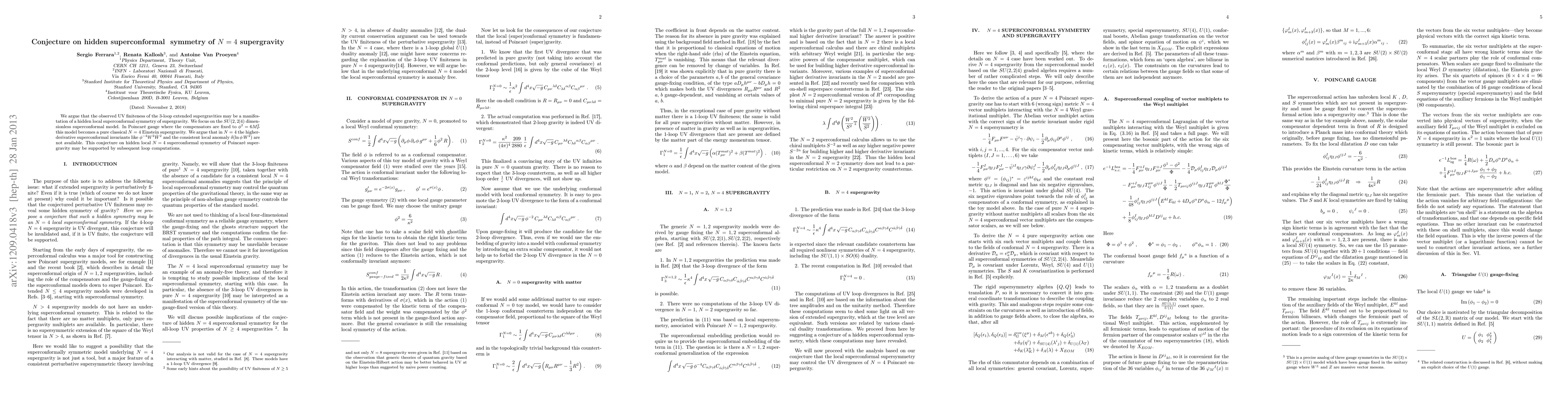 We argue that the observed UV finiteness of the 3-loop extended supergravities may be a manifestation of a hidden local superconformal symmetry of supergravity. We focus on the SU(2,2|4) dimensionless superconformal model. In Poincare gauge where the compensators are fixed to phi^2= 6 M_P^2 this model becomes a pure classical N=4 Einstein supergravity. We argue that in N=4 the higher-derivative superconformal invariants like phi^{-4}W^2 \bar W^2 and the consistent local anomaly delta (ln phi W^2) are not available. This conjecture on hidden local N=4 superconformal symmetry of Poincare supergravity may be supported by subsequent loop computations.