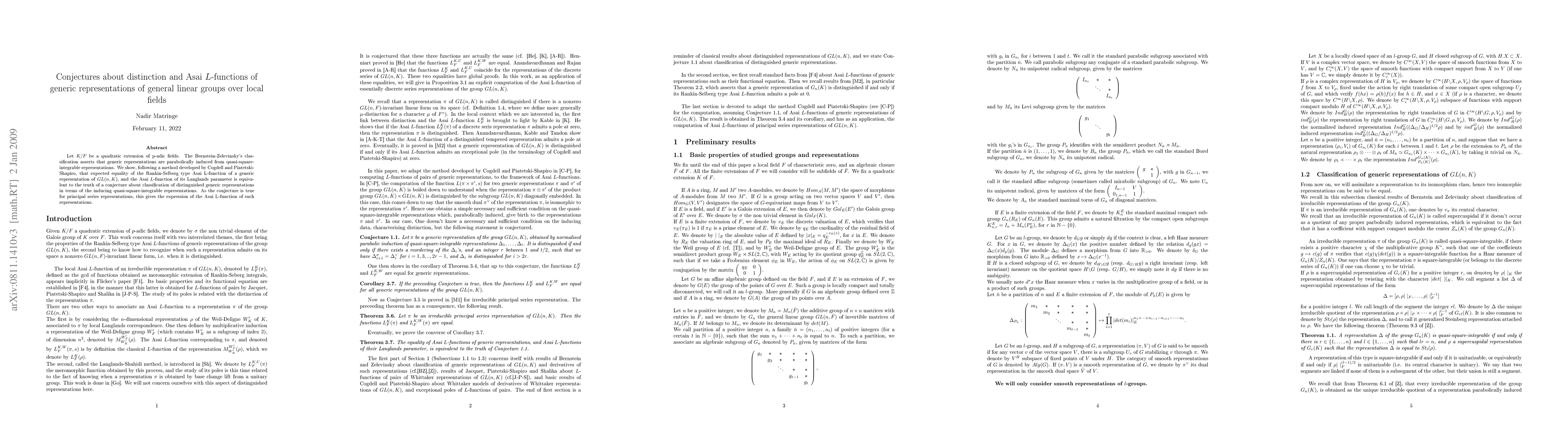 This paper explores the classification of generic representations of $GL(n,K)$ over quadratic extensions of p-adic fields, proving that the equality of certain Asai $L$-functions is equivalent to a conjecture about distinguished generic representations. The result holds for principal series representations, providing an expression for their Asai $L$-function.