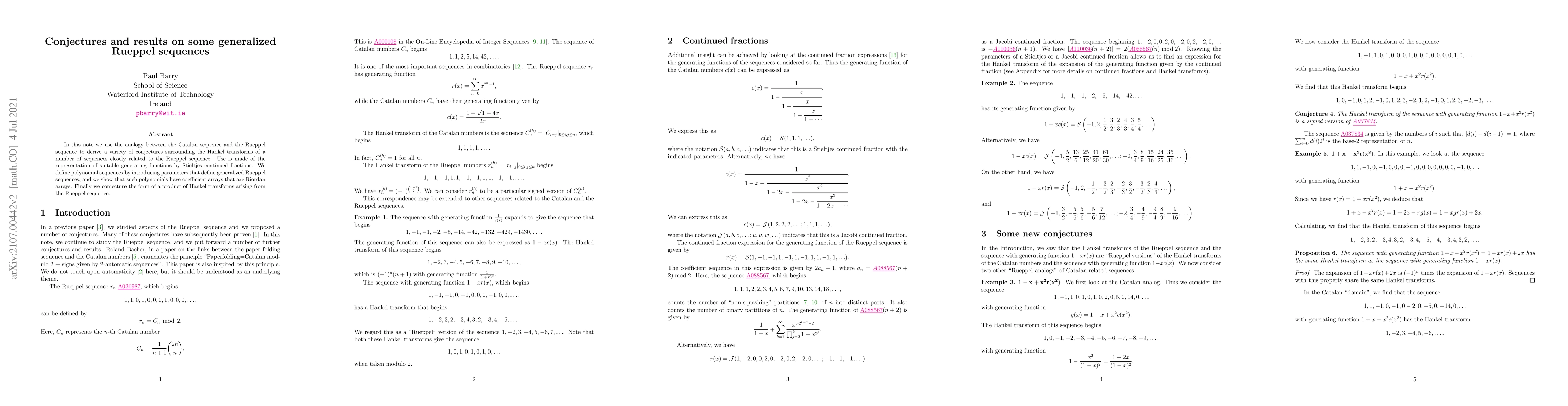 This paper explores generalized Rueppel sequences through the analogy with Catalan sequences, deriving conjectures about their Hankel transforms and employing Stieltjes continued fractions. It defines generalized Rueppel sequences as polynomial sequences with Riordan array coefficient arrays and conjectures a form for a product of their Hankel transforms.