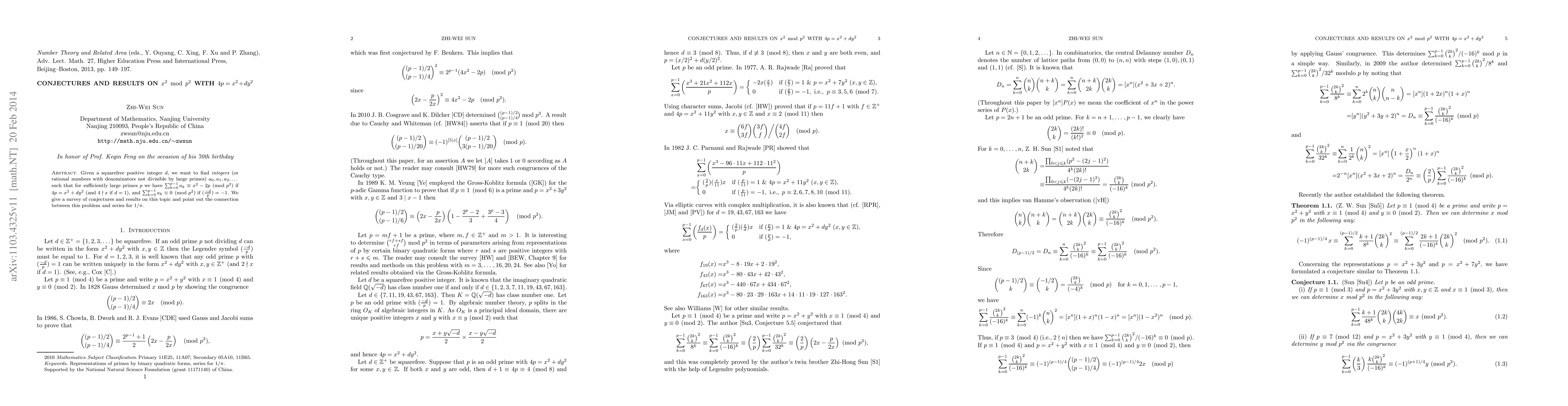 This paper surveys conjectures and results about finding integers $a_k$ such that their sum modulo $p^2$ relates to $x^2$ mod $p^2$ given $4p=x^2+dy^2$, with a special focus on connections to series representations for $1/\pi$. The study emphasizes conditions under which the sums equal $x^2-2p$ or $0$ modulo $p^2$.