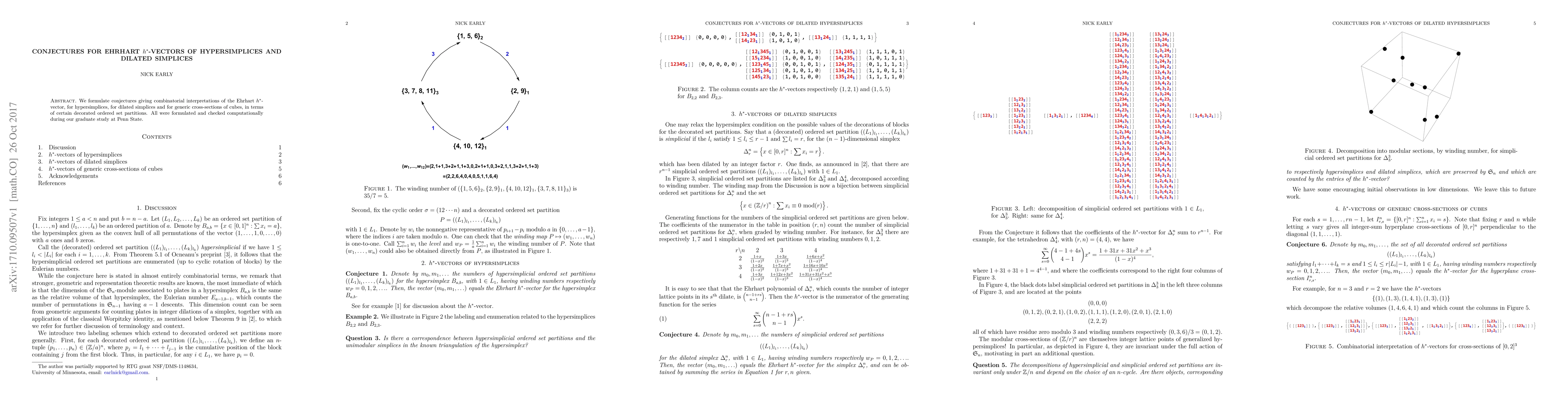 We formulate conjectures giving combinatorial interpretations of the Ehrhart $h^*$-vector, for hypersimplices, for dilated simplices and for generic cross-sections of cubes, in terms of certain decorated ordered set partitions. All were formulated and checked computationally during our graduate study at Penn State.