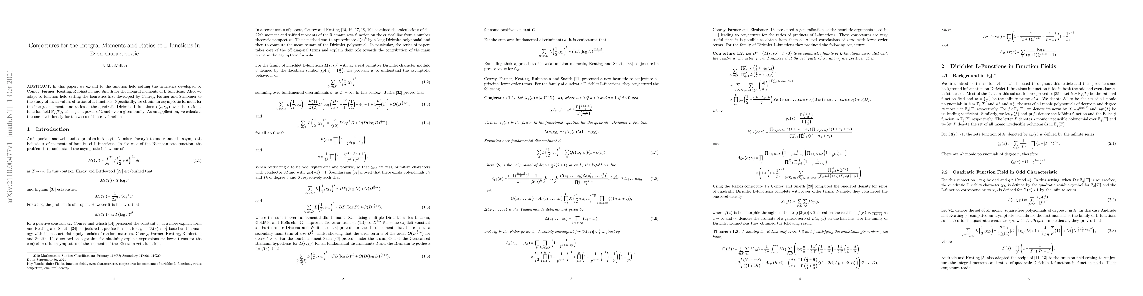 In this paper, we extend to the function field setting the heuristics developed by Conrey, Farmer, Keating, Rubinstein and Snaith for the integral moments of L-functions. Also, we adapt to function field setting the heuristics first developed by Conrey, Farmer and Zirnbauer to the study of mean values of ratios of L-functions. Specifically, we obtain an asymptotic formula for the integral moments and ratios of the quadratic Dirichlet L-functions $L(s,\chi_u)$ over the rational function field $\mathbb{F}_q(T)$, when $q$ is a power of 2 and over a given family. As an application, we calculate the one-level density for the zeros of these L-functions.