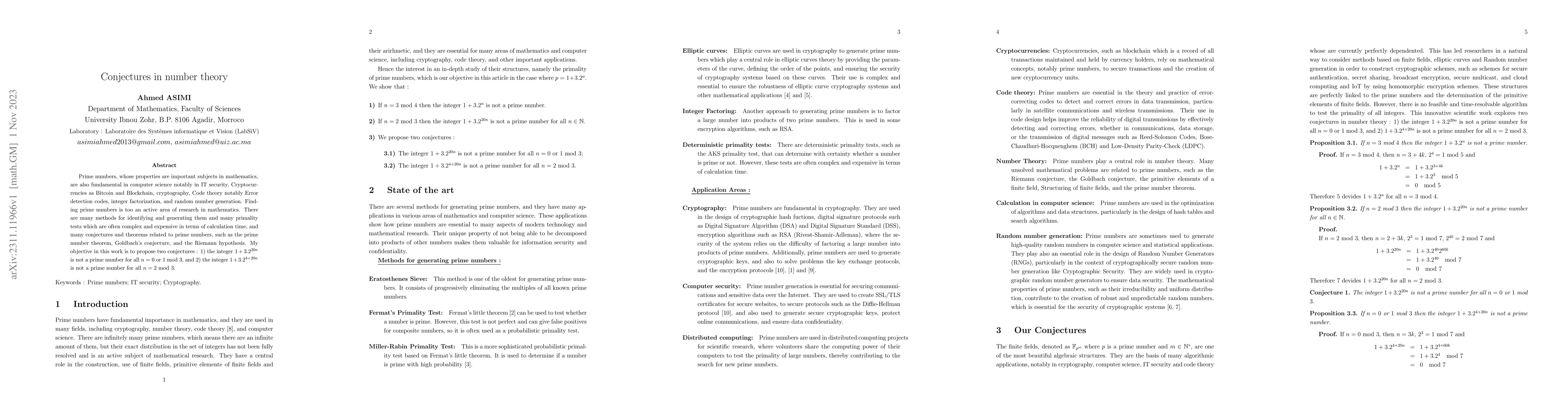 This paper explores conjectures related to prime numbers, proposing two new conjectures: $1+3.2^{20n}$ is not prime for $n=0$ or $1$ mod $3$, and $1+3.2^{4+20n}$ is not prime for $n=2$ mod $3$. The study highlights the significance of prime numbers in IT security, cryptography, and related fields.