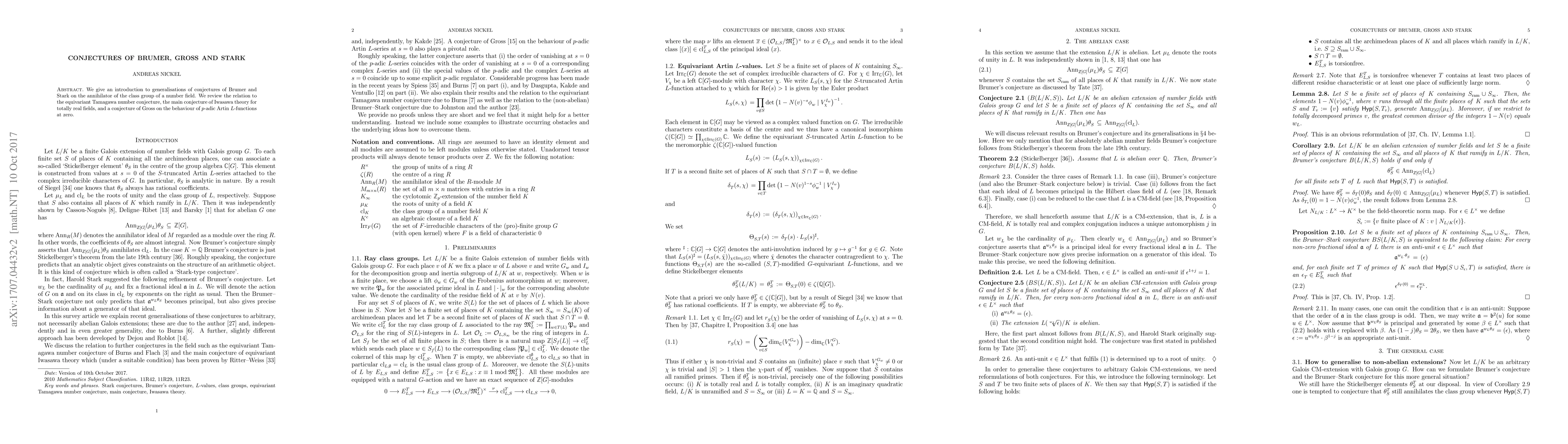Brumer, Gross, and Stark's conjectures generalize predictions about the annihilator of class groups in number fields, linking these to the equivariant Tamagawa number conjecture, Iwasawa theory's main conjecture, and $p$-adic Artin $L$-functions' behavior at zero. These conjectures provide deep insights into arithmetic geometry and number theory.